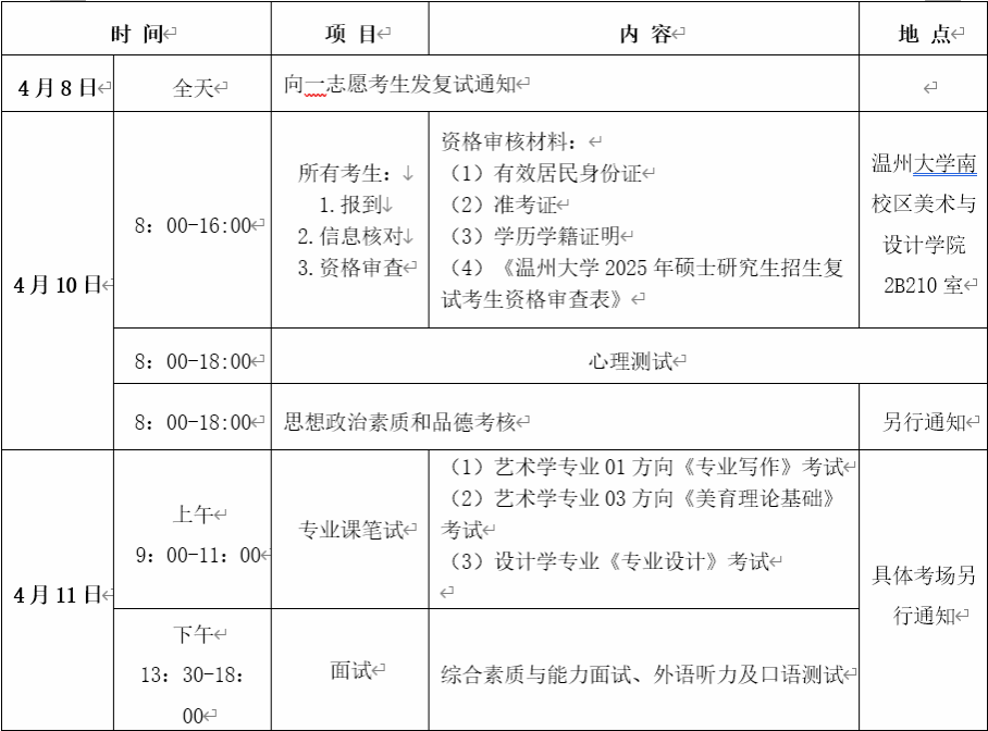 为加强管理,确保KY开元集团官网入口美术与设计2025年硕士研究生招生工作顺利完成,使复试录取工作更加规范化、制度化,根据教育部、省考试院、KY开元集团官网入口有关文件规定并结合学科特点,特制定本细则。一、组织机构学院成立研究生招生复试录取工作领导小组、思想政治素质和品德考核小组和专业复试考核小组,全面负责本学院的硕士研究生招生复试和录取工作。研究生招生复试录取工作领导小组,由院长、分党委书记、分管副院长、硕士点负责人、纪委书记、学科带头人组成。院长任组长,分党委书记、分管副院长任副组长,成员包括学院纪委书记和学位点负责人,具体指导本学院的研究生复试录取工作,维护学院复试工作公平公正,并做好考生复试期间的解释和投诉处理等相关工作。思想政治素质考核小组由学院书记、副书记和辅导员组成,负责对考生的思想政治素质和品德进行考核。专业复试考核小组由5-7名责任心强、教学经验丰富、业务水平高、公道正派的高级职称或相当人员组成,确定组长、副组长各1名,另配1-2名秘书(上述人员均须无直系亲属报考本专业,且是正式在职在编人员)。复试小组在学院研究生招生复试录取工作领导小组指导下,负责确定专业课考核、考生综合素质与能力面试、外语听力口语测试的具体内容、评分标准、程序,并具体组织实施。复试人员在复试中要严格执行复试程序和复试标准,认真做好复试记录(特别是面试现场的录音、录像和书面记录),复试小组成员必须现场独立评分,提高复试的公平性和有效性,保证复试质量。二、复试(一)复试资格审查:复试前,学院须对考生的居⺠⾝份证、学历学位证书、学历学籍核验结果、学⽣证、思想政治品德鉴定等材料及考⽣资格进⾏严格审查。对不符合规定者,不予复试。(二)进入复试的基本条件:KY开元集团官网入口复试分数线(调剂考⽣)不得低于KY开元集团官网入口规定的复试分数线。(三)复试比例:结合招⽣计划和⽣源等情况,实⾏差额复试,⼀志愿上线⼈数充⾜的专业、领域或⽅向,按照复试⽐例不低于 1:1.2;⼀志愿上线⼈数不⾜的专业、领域或⽅向,先进⾏⼀志愿复试,⼀志愿录取不⾜时,再进⾏调剂,调剂复试⽐例不低于 1:1.2。(四)复试方式及内容1.复试方式2025年开元官网硕士研究生招生复试采用现场线下方式。2.复试内容复试内容包括思想政治素质和品德考核、专业课笔试、综合素质与能力面试和外语听力口语测试。专业课考核考试科目及范围按《KY开元集团官网入口2025年硕士研究生招生专业目录》中所列执行。调剂专业复试内容如下:2.1 思想政治素质和品德考核主要是考核考生本人的现实表现,包括考生的政治态度、思想表现、道德品质、遵纪守法、诚实守信等方面。思想政治素质和品德考核不计入复试成绩总分,考核不合格者不予录取。2.2 专业课考核内容请参考《KY开元集团官网入口2025年研究生招生专业目录》,线下复试的专业课考核为笔试,时间为2小时,满分100 分。专业课成绩按30%计入复试成绩。2.3 综合素质与能力面试每位考生面试时间为20分钟左右,主要考核考生的基本技能、综合运用能力、创新能力等,考核中结合考生毕业论文、科研成果等补充材料,加强对考生既往学业、一贯表现、科研能力、综合素质等情况的全面考查。综合素质与能力面试成绩占 60%,成绩按优(95 分)、良(85 分)、中(75 分)、及格(65 分)、不及格(35 分)五级评分计分。专业复试小组为 5-7 ⼈,专业复试小组对每个复试考生当场独立打出成绩,去掉1个最高分和1个最低分,其他成绩平均后作为该考生的复试成绩(百分制)。学院对综合素质与能力面试成绩记为不及格的考生,应写出详尽评语。2.4 外语听力口语的测试根据《温州⼤学研究生招生复试中外语听力及口语测试实施⽅案》,对每位考生单独进⾏听力及口语测试,当场给出测试成绩,考生最后得分为该测试小组所有考官给定成绩的平均分。外语听力口语测试满分 10 分,直接计入复试成绩中。2.5 复试成绩满分为 100 分,其中专业课考试成绩占 30%,综合素质与能力面试成绩占 60%,外语听力口语测试占 10%。二、调剂工作程序1.学校在教育部规定时间内,于中国研究生招生信息网公布调剂复试办法、联系咨询电话、各调剂专业和相关调剂信息。考生登录“全国硕士研究生招生调剂服务系统”向我校提交调剂申请。2. 学院通过“全国硕士研究生招生调剂服务系统”网站筛选本学院调剂考生情况,确定复试名单并报研究生院审批后,通知考生复试。3. 学院将复试合格同意拟录取的名单及时报研究生院,经研究生院审核后,再通过“全国硕士研究生招生调剂服务系统”给调剂考生发送待录取信息。4.调剂考生在规定时间内确认同意待录取。三、调剂1. 调剂考生初试成绩须符合第一志愿报考专业在调入地区的全国初试成绩基本要求,并符合调入专业的报考条件。2.复试采用现场线下方式,复试比例不低于1:1.2。2.调剂考生第一志愿专业与调入专业相同相近,或初试科目与调入专业初试科目相同相近。具体要求见下表:所有调剂考生必须通过教育部指定的“全国硕士生招生调剂服务系统”进行。每次开放调剂系统持续时间不得低于12个小时。对申请同⼀招生单位、同一专业、初试科目完全相同的调剂考生,按考生初试成绩择优遴选进入