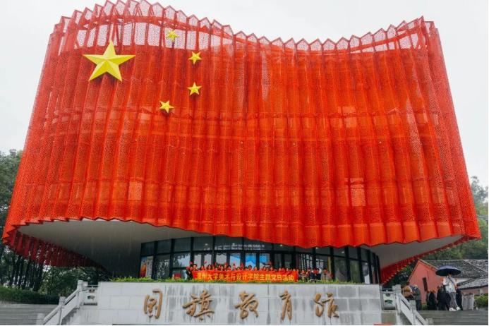 为深入贯彻习近平新时代中国特色社会主义思想,认真贯彻落实党的二十大精神,2022年11月2日下午,KY开元集团官网入口学生党员来到了全国首家综合性国旗教育馆——瑞安国旗教育馆,开展“赓续红色血脉 奋进时代征程”主题党日活动。党员们在五星红旗前行注目礼,在巨幅屏幕前体验了一次特殊的升旗仪式,在慷慨激昂的国歌声中齐声合唱,在校友曾联松先生的雕像前追忆国旗的设计历史……凝视着鲜艳的五星红旗,更加坚定了党员们奋进的步伐。 瑞安国旗教育馆位于西山之巅,总建筑面积2600多平方米,其中布展面积近2000平方米。展馆共有4层,以“天圆地方、天瑞地安,鼎盛中华、红旗飘扬”为设计主题。 忆往昔峥嵘岁月,筚路蓝缕、栉风沐雨,不变的是鲜红的旗帜,不变的是华夏儿女赤诚的初心。移步至国旗诞生厅内,讲解员向大家讲述了设计者曾联松从缘起到邂逅、与五星红旗之间的故事。通过五星红旗诞生的故事,党员重温了国旗的设计理念。了解国旗的制作、国旗的涵义、国旗的标准等内容,感受“一旗、一人、一馆、一城”的情缘。 五星红旗在设计上非常讲究,整体布局中偏庄严庄重。该旗采用非对称的设计,旗面左上方缀五颗黄色五角星。一星较大,其外接圆直径为旗高十分之三,居左;四星较小,其外接圆直径为旗高十分之一,环拱于大星之右。利用向心角度变化每一个角都能指向大的五角星,星布成椭圆形,大星导引于前,小星环绕于后,恰似众星拱北斗的红地五星旗,同时以大小之势,呈现出了这组图案的张力与立体感,并在视觉感官上给人以协调和平衡。同时五星红旗又叫红地五星旗,红色代表革命,五颗红星象征着中国革命人民的大团结,是中华人民共和国的象征和标志。它见证着牺牲与奉献,代表着神圣与崇高,寄托着热爱与自豪。 浩渺行无极,扬帆但信风。学生党员们在党旗前重温入党誓词,在馆内外唱响《我爱你,中国》,表达青年学生党员的爱国情、强国志、报国行。 本次主题党日活动,以国旗为主线引导党员深入了解红色政权来之不易、新中国来之不易、中国特色社会主义来之不易,回顾中国共产党带领祖国崛起的历史性时刻。作为新时代的美院学子,曾联松先生让后辈感受到了青年匠人需要的担当和使命。激励青年党员将不断提高专业技能,加强党史学习,提升党性修养,不忘初心,砥砺前行,不负新时代,做好答卷人。