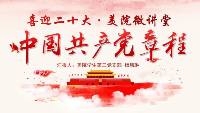 本期“喜迎党的二十大 美院微讲堂”活动由温大美院学生党员杨慧琳进行宣讲,带领大家学习党章的基本内容。中国共产党第十九次全国代表大会,对中国共产党章程又做了多方面的重要修改。主要是体现了十八大以来马克思主义中国化的最新发展成果,体现了以习近平同志为核心的党中央治国理政新理念新思想新战略,体现了坚持和加强党的领导、全面从严治党的经验。