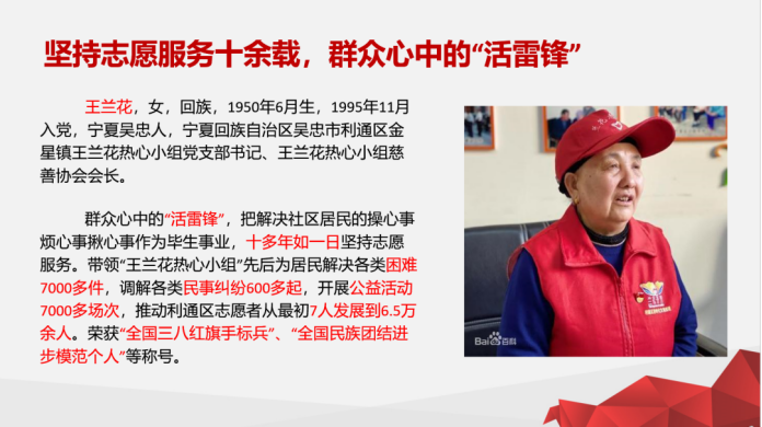 坚持志愿服务十余载,群众心中的“活雷锋”王兰花,女,回族,1950年6月生,1995年11月入党,宁夏吴忠人,宁夏回族自治区吴忠市利通区金星镇王兰花热心小组党支部书记、王兰花热心小组慈善协会会长。群众心中的“活雷锋”,把解决社区居民的操心事,烦心事,揪心事作为毕生事业,十多年如一日坚持志愿服务。带领"王兰花热心小组”先后为居民解决各类困难7000多件,调解各类民事纠纷600多起,开展公益活动7000多场次,推动利通区志愿者从最初7人发展到6.5万余人。荣获“全国三八红旗手标兵”、“全国民族团结进步模范个人”等称号。