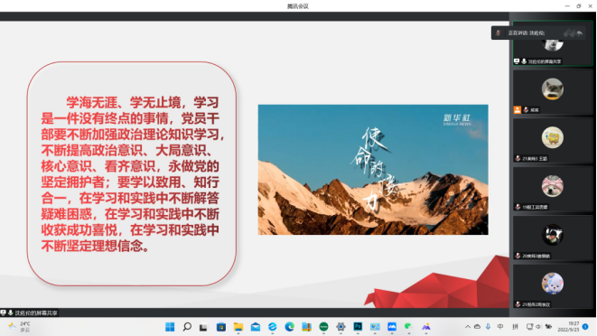 01 课程介绍宣讲人:沈佐伦本期“喜迎党的二十大 美院微讲堂”活动由温大美院学生党员沈佐伦进行宣讲,带领大家学习共产党人的初心和使命。习近平总书记强调了初心和使命的重要意义。中国共产党在那么弱小的情况下能够逐步发展壮大起来,在腥风血雨中能够一次次绝境重生,在攻坚克难中能够不断从胜利走向胜利,根本原因就在于不管是处于顺境还是逆境,我们党始终坚守为中国人民谋幸福、为中华民族谋复兴这个初心和使命。02 活动方式活动时间:2022年9月25日18:30-19:30活动地点:线上 03 课程回顾七一勋章案例介绍坚持志愿服务十余载,群众心中的“活雷锋”王兰花,女,回族,1950年6月生,1995年11月入党,宁夏吴忠人,宁夏回族自治区吴忠市利通区金星镇王兰花热心小组党支部书记、王兰花热心小组慈善协会会长。群众心中的“活雷锋”,把解决社区居民的操心事,烦心事,揪心事作为毕生事业,十多年如一日坚持志愿服务。带领"王兰花热心小组”先后为居民解决各类困难7000多件,调解各类民事纠纷600多起,开展公益活动7000多场次,推动利通区志愿者从最初7人发展到6.5万余人。荣获“全国三八红旗手标兵”、“全国民族团结进步模范个人”等称号。 初心,使命的要求不忘初心方能行稳致远,牢记使命才能开辟未来。习近平总书记指出:我们党正带领人民进行具有许多新的历史特点的伟大斗争,必须不断深化党的自我革命,持续推动全党不忘初心、牢记使命。在未来的征程上,广大党员干部只有更好地守初心、担使命,把理想信念转化为攻坚克难的强大力量,万众一心,我们才能走好新时代的长征路,实现中华民族伟大复兴的中国梦。 青年大学生的初心和使命学海无涯、学无止境,学习是一件没有终点的事情,党员干部要不断加强政治理论知识学习,不断提高政治意识、大局意识、核心意识、看齐意识,永做党的坚定拥护者:要学以致用、知行合一,在学习和实践中不断解答疑难困惑,在学习和实践中不断收获成功喜悦,在学习和实践中不断坚定理想信念。 04 心得体会21美师1 沈柯莹本次微讲堂的主题是:不忘初心、牢记使命,高举中国特色社会主义伟大旗帜,决胜全面建成小康社会,夺取新时代中国特色社会主义伟大胜利,为实现中华民族伟大复兴的中国梦不懈奋斗。“不忘初心、牢记使命”就是为中国人民谋幸福,为中华民族谋复兴。主讲人列举了三位不忘初心、牢记使命的人物:点亮贫困山区女孩梦想的“校长妈妈”张桂梅、坚持志愿服务十年余载,群众心中的“活雷锋”王兰花、做工人要做到最好,我国焊接领域“领军人”艾爱国。让我感触最深的是“校长妈妈”张桂梅,十年树木百年树人,张桂梅用自己的教育初心,通过19年的努力实践创造了一个又一个教育奇迹,她知行合一,身体力行,用行动向我们上了“不忘初心、牢记使命”的一课。20美师3 陈淑慧本次美院微讲堂始终围绕“不忘初心、牢记使命”展开。而这句话强调的就是切实做到为中国人民谋幸福,为中华民族谋复兴。之所以“为中国人民谋幸福”作为中国共产党的核心,是因为一个政党的前途命运,最终取决于民心向背。人民是党执政之根基。而张桂梅同志则是身体力行地诠释了“为中国人民谋幸福”。张桂梅校长不畏风雨与艰险,筹资建立女子高中。她身患风寒重症,每天吃着数种药物,但这也没有阻拦她帮助贫困女孩走出大山的梦想,甚至为培养学生几乎付出生命。如同张校长一般,广大党员干部只有更好的坚守初心、担任使命,万种一心,才能走好新时代的长征路,实现中华民族伟大复兴的中国梦。19服设4 单雨欣不忘初心,什么是不忘初心、牢记使命?它是中国共产党第十九次全国代表大会的主题,它强调的是共产党人的初心和使命——为中国人民谋幸福,为中华民族谋复兴。这个初心和使命就是激励党和人民不断前进的根本动力。这是全体党员、干部的终身课题,因此我们必须用马克思主义中国化最新成果统一思想、统一意志、统一行动。前有点亮贫困山区女孩梦想的校长妈妈,坚持志愿服务十余载的活雷锋,现在有奔赴抗疫战场第一线的白衣天使,每个人都在用自己的方式来实现自己的初心和使命,作为当代大学生的我们,必须发扬斗争精神,勇于担当作为,不断坚定我们的理想信念。21美师3 王颖今天的微讲堂主要讲了十九大报告上,习近平总书记的一句话——“不忘初心、牢记使命”。微讲堂中举了三个党员的例子——他们平凡而又伟大,他们是普通人而不是天才,但却有一颗对党的衷心和对人民的热爱,他们这辈子坚持的是“全心全意为人民服务”的宗旨。其中,最令我印象深刻的是张秀梅同志。从高中的时候我就了解过她的事迹。她在面临学校办不下去的时候,发现有8个老师是党员,她就带着这8个老师在党旗下宣誓。硬是凭着这份对党的信念,把学校越办越好,把好多学生送出了大山。我觉得这就是“不忘初心、牢记使命”的真实体现。 19服设4 蔡安娜不忘初心、牢记使命,高举中国特色社会主义伟大旗帜,决胜全面建成小康社会,夺取新时代中国特色社会主义伟大胜利,为实现中华民族伟大复兴的中国梦不懈奋斗是中国共产党第十九次全国代表大会的主题,什么是不忘初心呢,就是共产党人的初心和使命——“为中国人民谋幸福,为中华民族谋复兴”,这是我从十九大中学会的,我们