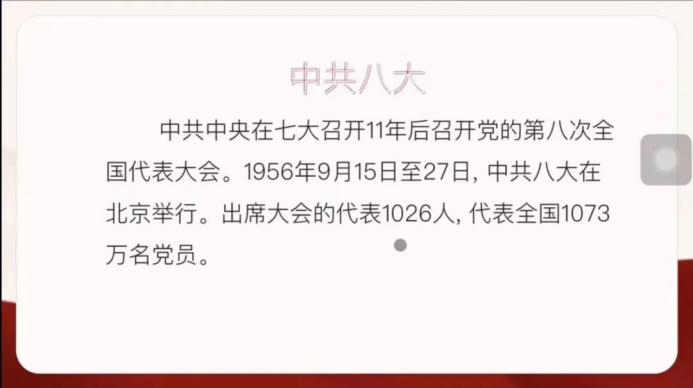 中共八大:中共中央在七大召开11年后召开党的第八次全国代表大会。1956年9月15日至27日,中共八大在北京举行。出席大会的代表1026人,代表全国1073万名党员。