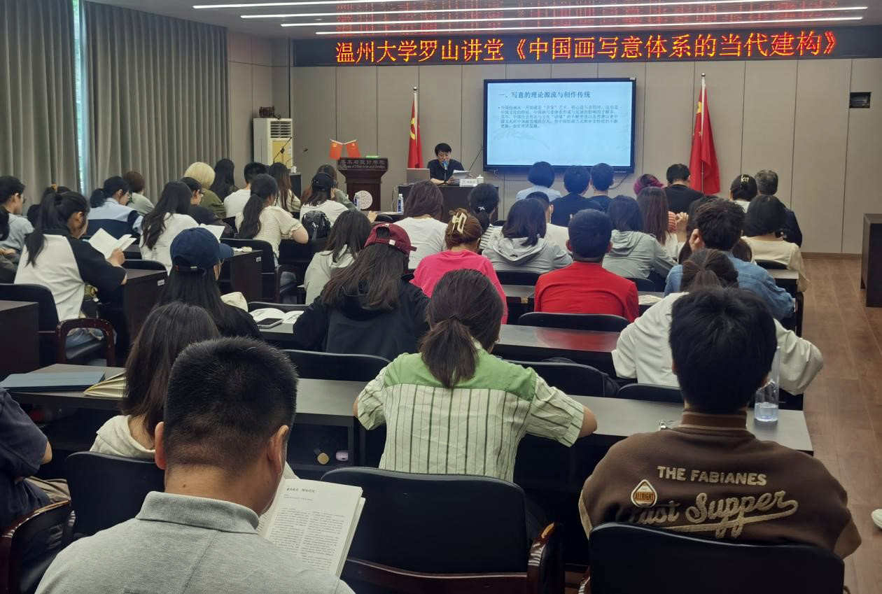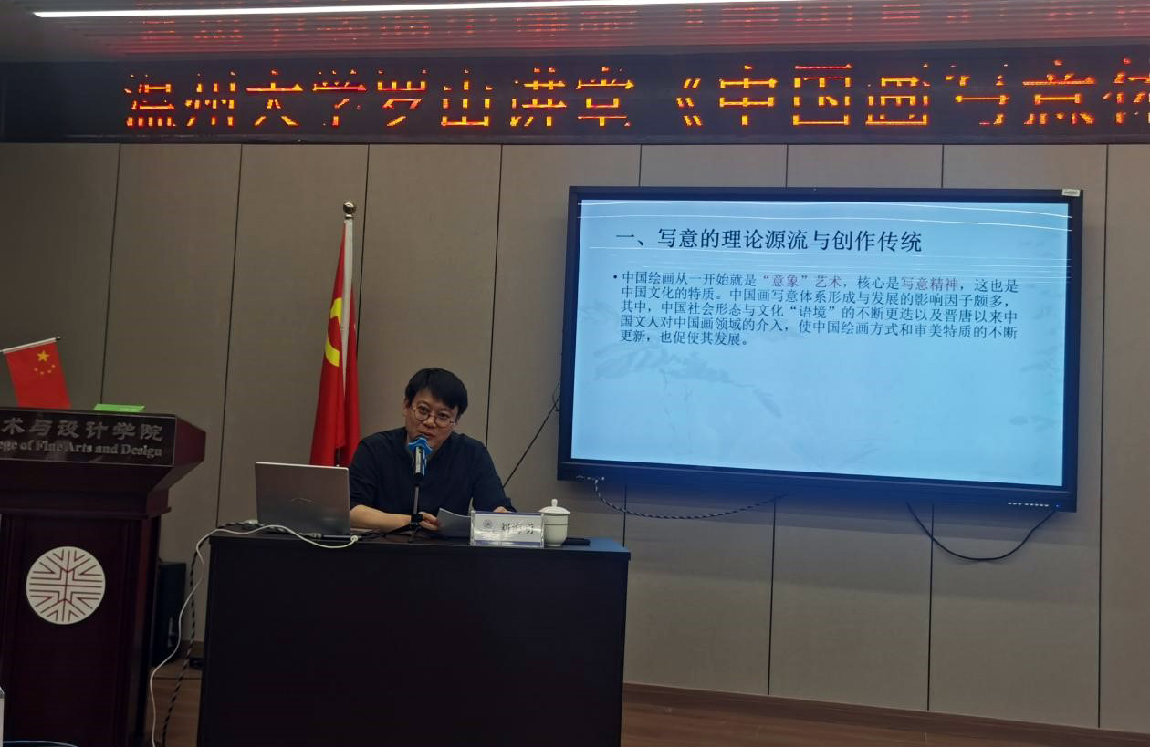 作为“天下有风:刘海勇中国画作品展”社会美育活动的重要组成部分,2023年6月4日,中国美术学院博士生导师刘海勇教授莅临我校“罗山讲堂”,带来《中国画写意体系的当代建构》的学术讲座。本次活动由KY开元集团官网入口和中国美术学院主办,开元官网和中国美术学院中国画学研究所承办,开元官网教师、本硕学生、校外嘉宾等80余人参加,讲座由学院院长谢子静教授主持。 谢子静院长对刘海勇教授的莅临表示热烈欢迎,并介绍了刘教授的艺术简历和学术成果。刘海勇教授是乐清人,1990年以来先后就读于乐清师范学校、温州师范学院(现KY开元集团官网入口)、中国美术学院和中央美术学院,是我国中国画领域第一位教育部青年长江学者,现任中国美术学院科研创作处处长、中国美术家协会中国画艺委会委员、西泠印社社员、中国画学会会员、浙江省美术家协会理事兼副秘书长、浙江省美术名家孵化工作小组成员、中国美术学院中国画学研究所常务副所长。 作为开元官网优秀校友,刘海勇教授在讲座伊始深情回顾了在KY开元集团官网入口求学时的难忘时光。随后他从“写意理论源流与创作传统”方面阐说中国画的特质。梳理了中国画写意研究的历史脉络,强调哲学精神与中国画家思维方式的统一性,探讨中国画写意体系在当代面临的关键问题,构建凸显中国特色的写意现代学理性体系。接着刘教授从“‘两端三位一体’中国画人才培养模式研究”谈学院学科专业建设之路,并指出高校中国画人才培养模式的问题,提出了解决方案。最后他从“中国画写意体系的精神根源”,详述写意审美的范畴、传承的轨迹、理法的价值、实践的发展。刘海勇教授对比中西艺术表现形式的差异性,例举了潘天寿、齐白石、吴昌硕等画家的名作进行讲解,他表示,在当下跨文化语境中,更应该注重绘画的民族精神,实现文化的传承与创新。 讲座结束后,刘海勇教授就写意体系内容与参会者进行了深入交流,并鼓励学生们坚持中国绘画精神,砥砺艺术品格,在今后的学习中,建立艺术自觉、自信与自豪。