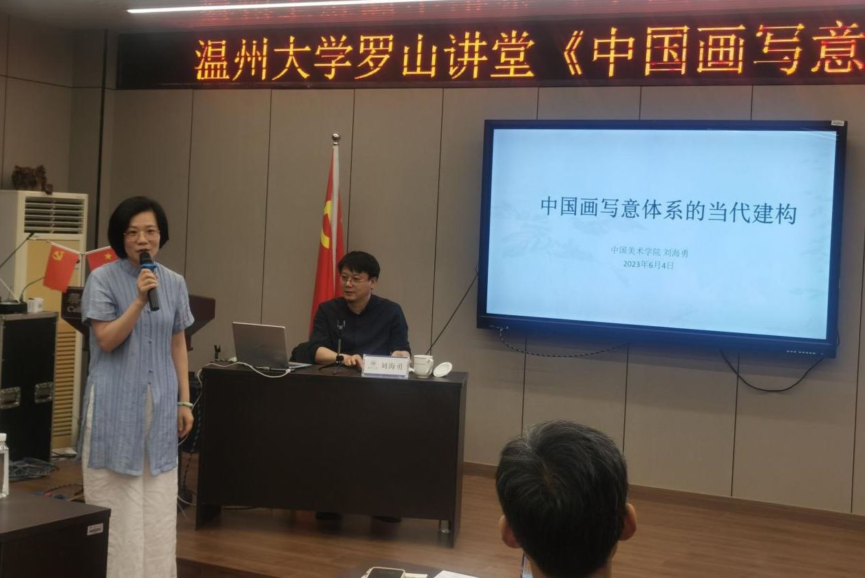 谢子静院长对刘海勇教授的莅临表示热烈欢迎,并介绍了刘教授的艺术简历和学术成果。刘海勇教授是乐清人,1990年以来先后就读于乐清师范学校、温州师范学院(现KY开元集团官网入口)、中国美术学院和中央美术学院,是我国中国画领域第一位教育部青年长江学者,现任中国美术学院科研创作处处长、中国美术家协会中国画艺委会委员、西泠印社社员、中国画学会会员、浙江省美术家协会理事兼副秘书长、浙江省美术名家孵化工作小组成员、中国美术学院中国画学研究所常务副所长。