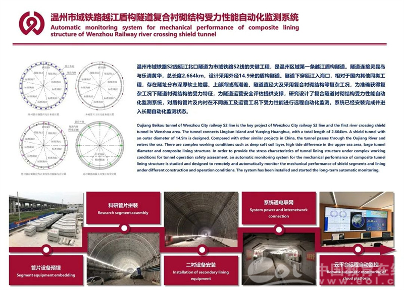产品奖金奖获奖作品直击温州市域S2线瓯江北口隧道监测难度大、监测安全隐患大的痛点,不断创新设计、克服万难,提高了监测仪数据采集的精度和传感器耐久性及传感器植入成活率,并实现了采集信息向隧道外的远程传输,同时提高了结果反馈的合理性。目前该产品已安装完成并进入长期自动化监测状态。