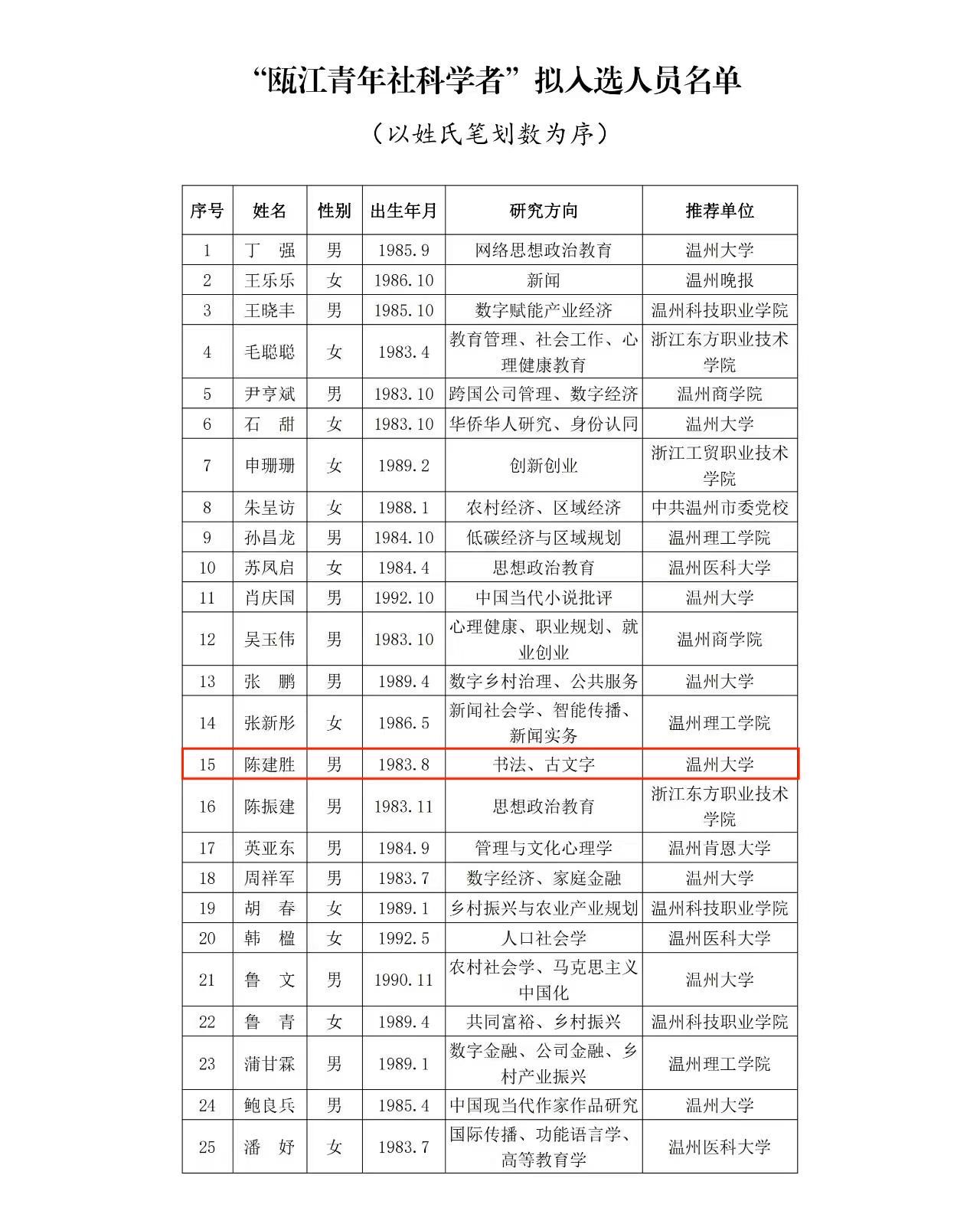 喜报:开元官网教师陈建胜同志荣获温州市“瓯江青年社科学者”人才称号