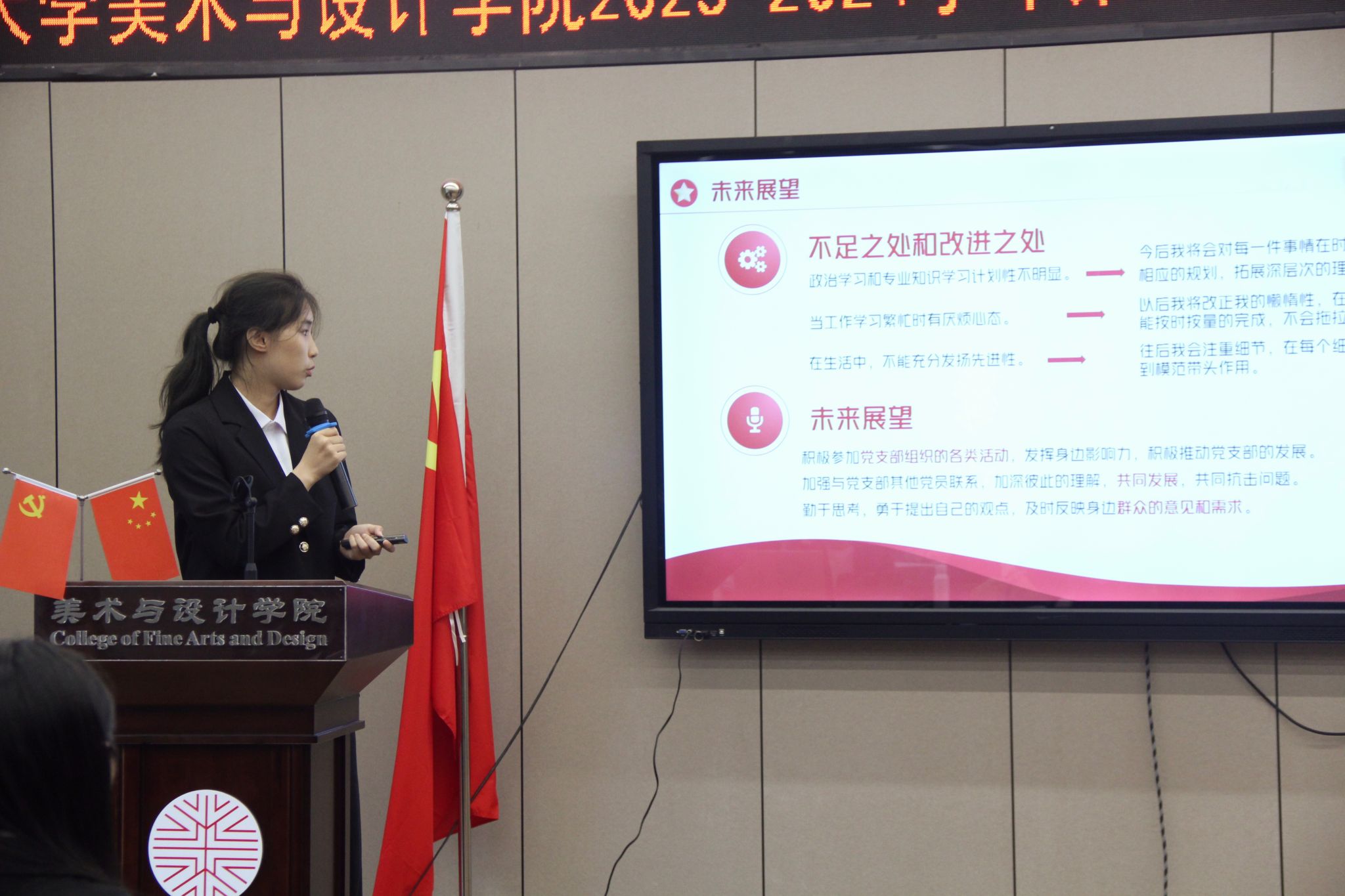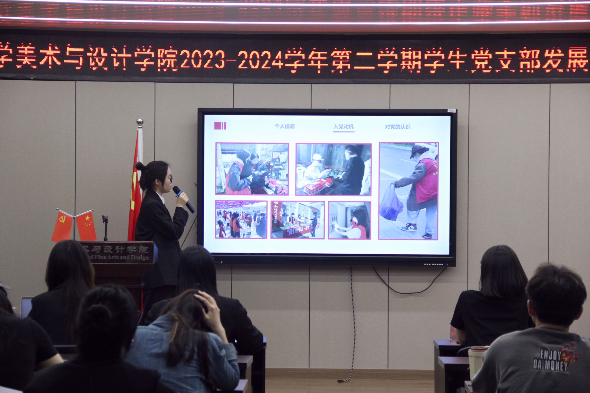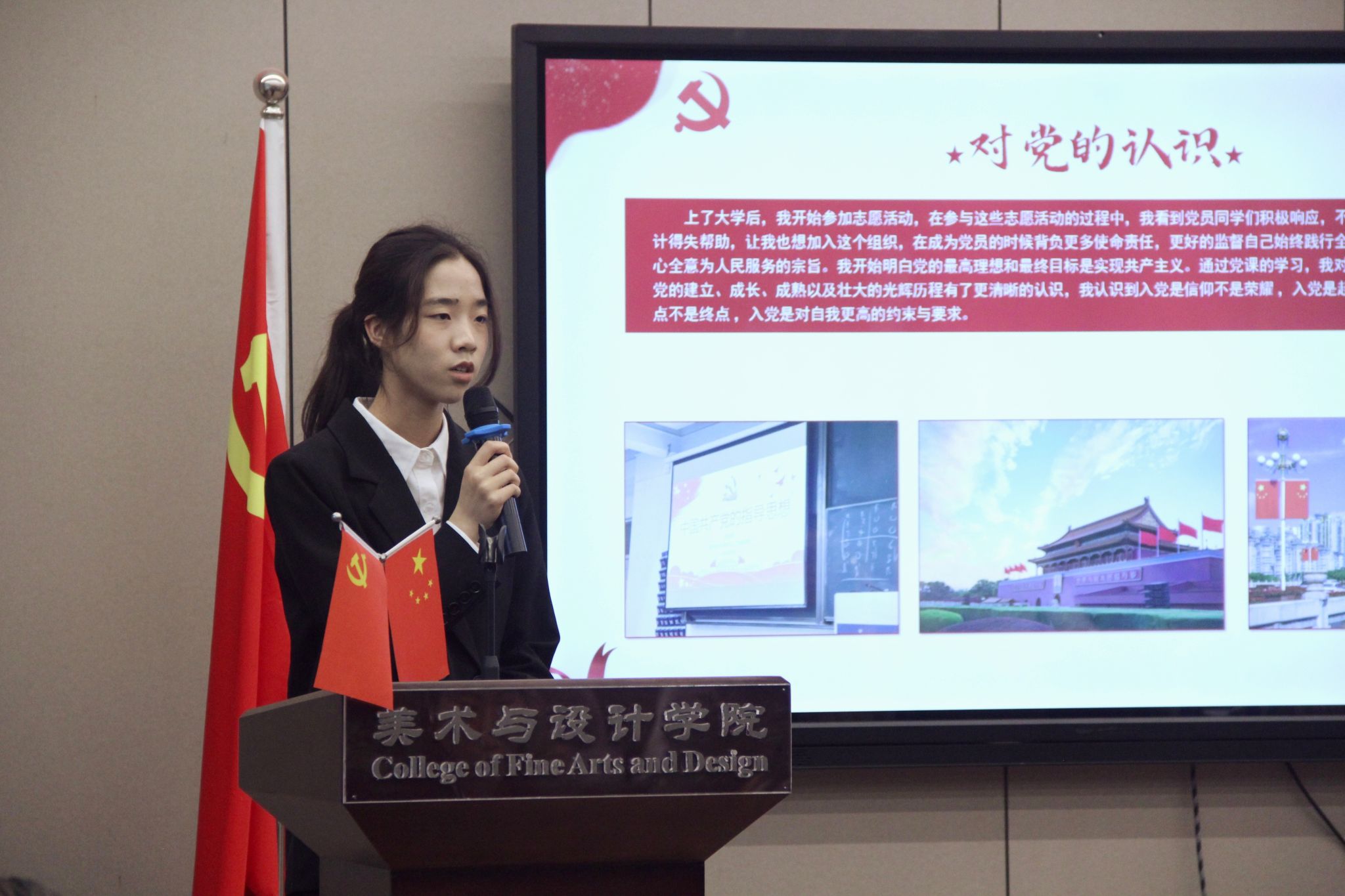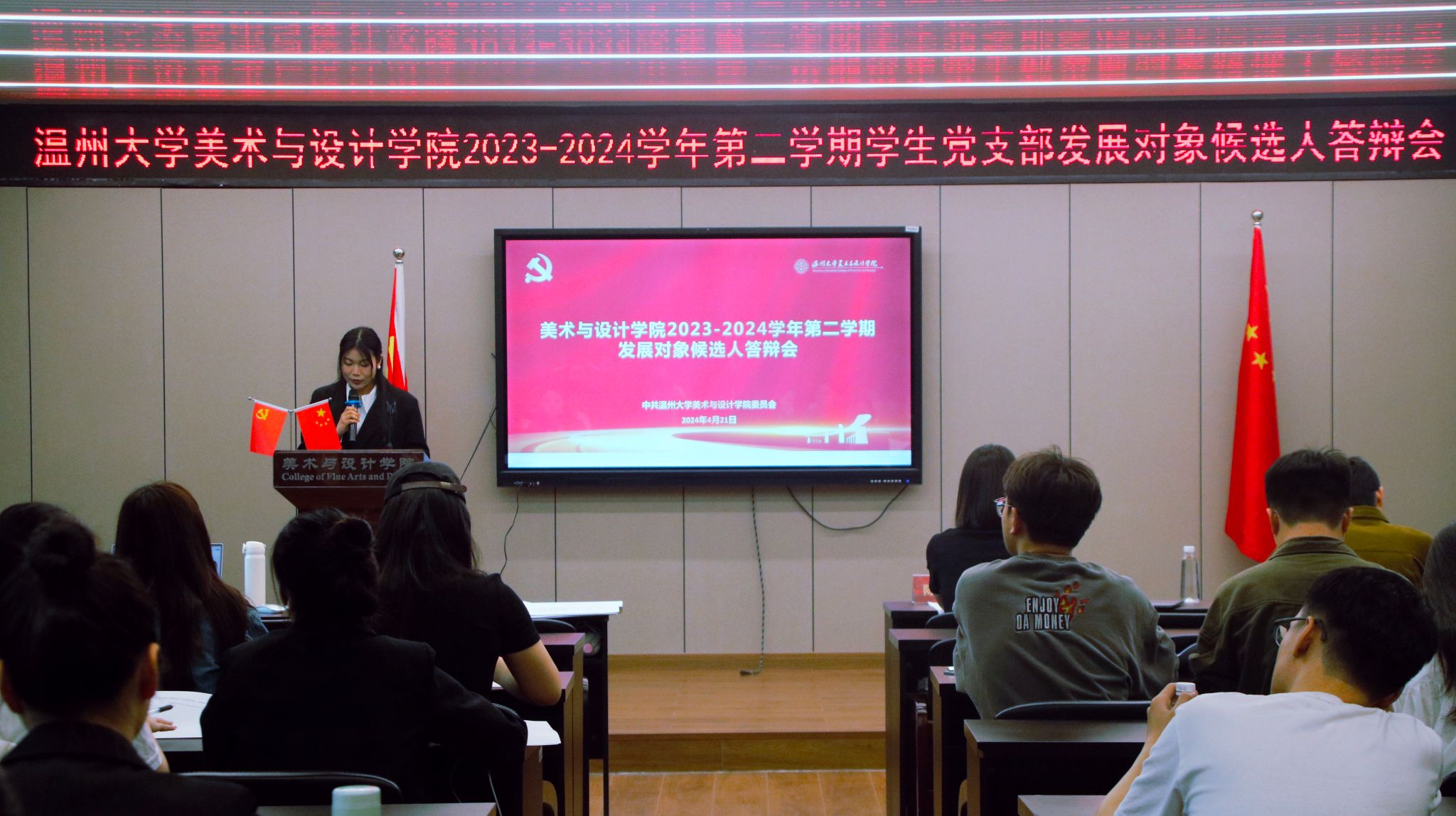 会议伊始,学生第三党支部党员汤佩遥同志进行答辩前汇报,宣布本次答辩会的议程和相关要求。51位发展对象候选人依次根据ppt讲述自己被列为入党积极分子以来的思想、学习、工作、生活等方面的情况以及自身存在的不足与问题,汇报对党的认识,入党动机,以及今后的努力方向。