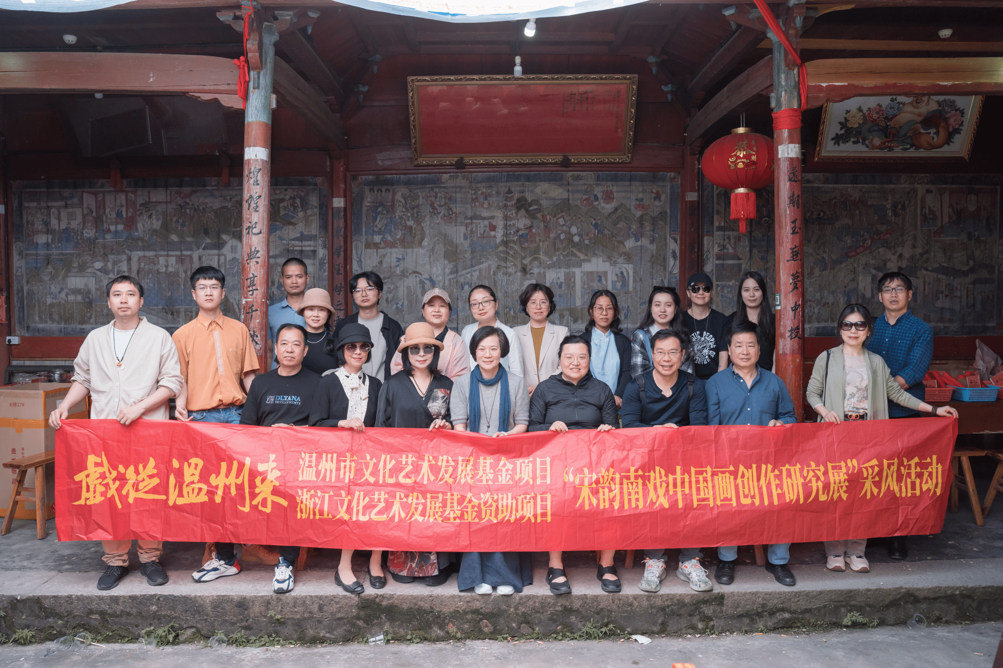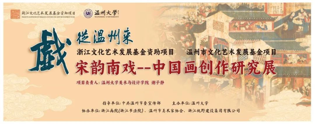 谢子静教授作项目介绍,温州素有“南戏故里”之称,自宋至今,戏曲在温州、浙江乃至全国各地得到了传承和发展。自当代以来,南戏文化在不断演变,包括戏曲文化与民俗文化,它们与中国画艺术相融合并以各种形式不断传承蜕变。她介绍,本次展览将以南戏名剧为核心,同时结合温州各地的古戏台建筑及戏曲壁画,以期对戏曲历史的挖掘追寻对时代精神的描摹和探寻南戏之源。通过美术作品创作的形式展现宋韵文化的传承,宣扬温州独特的文化和时代风貌,致力于对“宋韵精神”在当代历史进程中的继承发扬展开考察与探索。她继而说道:“在接下来的创作中,项目将以人物画、花鸟画、山水画不同题材形式展现宋韵文化,并包括以下五个创作主题:一是关注南戏文化的‘戏曲故里’;二是关注经典剧目的‘南戏探源’;三是关注古戏台等遗迹的‘宋韵遗迹’;四是关注服装、化妆、道具等纹样的‘几度飞花’;五是关注温州戏曲美术创作的现代转换‘时代风貌’。”