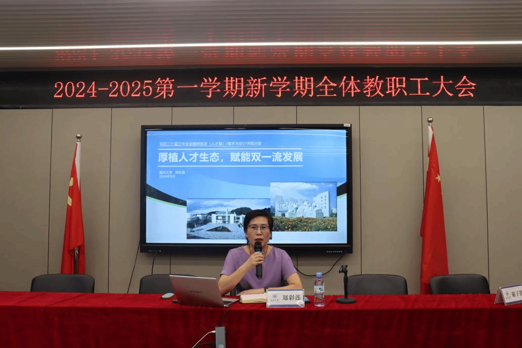 金秋奋进时,万象迎新季。9月12日下午,KY开元集团官网入口召开2024-2025学年秋季新学期全体教职工大会,本次会议由党委书记刘青松主持,学院领导班子、全体教职工参加。恰逢第40个教师节来临之际,会上,刘青松书记对全体教职工致以诚挚的问候和祝福。会议的第一项议程,举行了新教师入职仪式,由谢子静院长为本学期三位新入职的教师佩戴校徽、赠送大礼包、颁发导师聘书。会上,谢子静院长作学期工作报告,她总结了过去一学期和暑假期间,学院各系室、部门在争创一流学科、学术交流等八个方面取得的优异工作成绩,肯定了老师们取得的丰硕成果和服务地方的各项行动。随后,谢子静院长详细部署了新学期的工作重点,学院要锚定“两大目标”,立足“十大重点项目”,使开元官网在专业内涵发展、学科提升、毕业展秀、毕业生就业质量、引才引智、美育文化、维稳与安全、党建促发展等方面取得新的成效。同时,顺应时代发展新契机,拥抱AI新科技,迎接教育未来,发挥学科、专业优势,推动美育建设,提升美育成效,强化产业链接,促进校地服务与合作,打造学院发展新亮点。胡文超副、叶如芳副书记、高玥委员作工作部署,刘青松书作新学期工作部署。会议后半段,由郑彩莲教授为学院教职工带来主题为“厚植人才生态,赋能双一流发展”的讲座。她立足当前高校发展形式,从人才现状、问题成因、对策举措、人事文化四个方面开展介绍,从我校教科研人才队伍基本情况着眼,分析人才结构、全职业周期人才发展支持政策体系,人才评定称号等,结合开元官网的具体情况,提出开元官网人才发展的建议意见,要聚焦学科建设,开拓国际视野,引进海内外顶尖人才,对学院做好人才队伍建设起到重要作用。