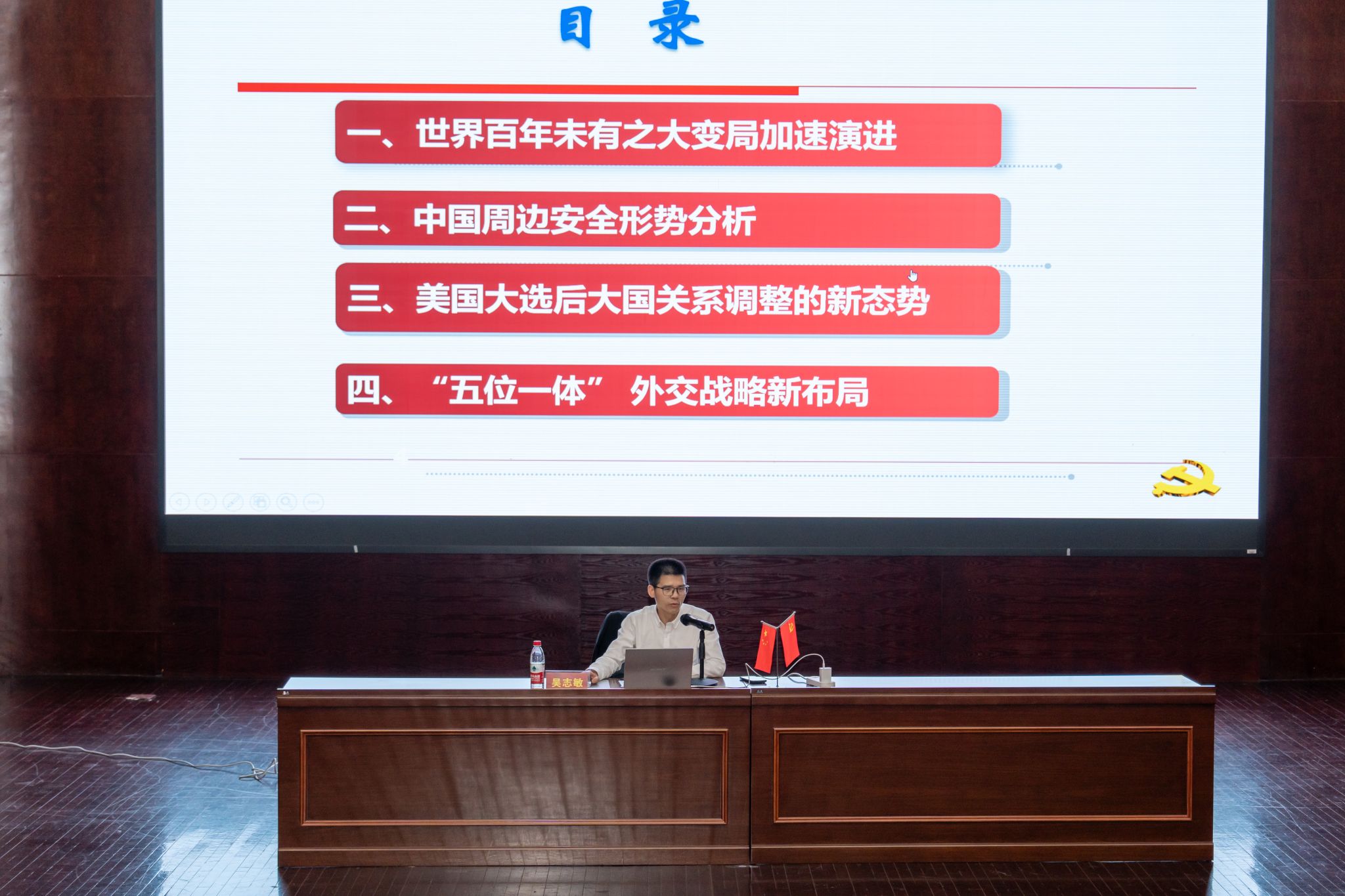 KY开元集团官网入口教务处副处长吴志敏同志带来专题讲座第二讲:《当前国际形势与国家安全》。吴志敏教授结合自己多年的学术研究与实践积累,围绕世界百年未有之大变局加速演进、中国周边安全形势分析、美国大选后大国关系调整的新形势和“五位一体”外交战略新布局四个方面,聚焦当前国际形势中的热点,详细讲解了我国在国家安全方面所面临的国际国内形势。