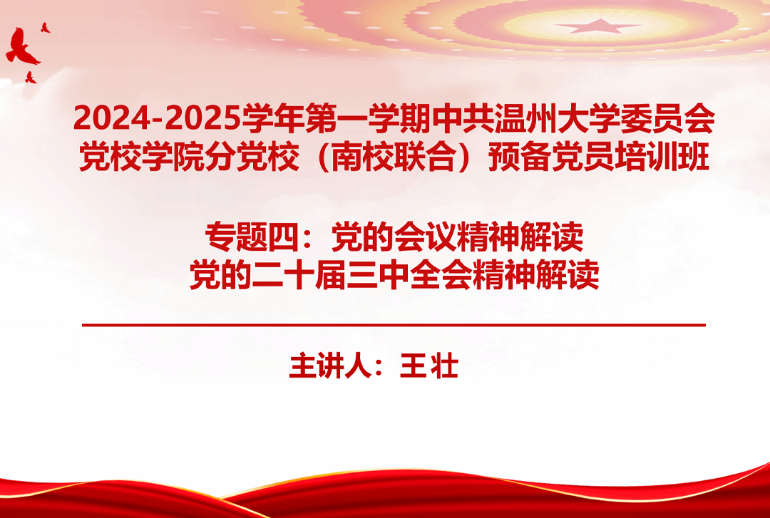 KY开元集团官网入口建筑工程学院党委书记、副院长王壮同志带来专题讲座第四讲——党的二十届三中全会精神解读。会上,壮老师以深刻领会和把握党的二十届三中全会精神为题,从全会的基本情况、习近平总书记的重要讲话精神、《决定》提出的重大举措、大学生党员深化改革等四个方面进行了系统讲解和深入阐释。全面准确地讲述了党的二十届三中全会精神的丰富内涵和精神实质,着力提升了广大预备党员们的政治素养。最后强调要充分认识全会的重大意义,深刻把握进一步全面深化改革的战略重点,更加紧密地团结在以习近平同志为核心的党中央周围,同心协力推进中国式现代化建设,谱写民族复兴伟业的历史新篇章。