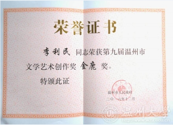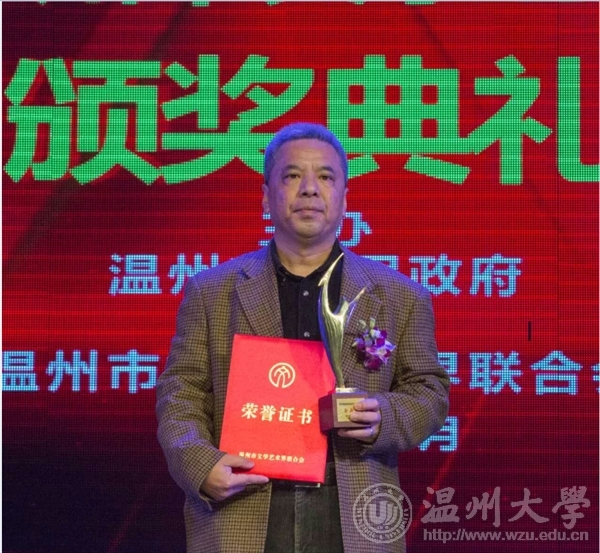 2016年12月29日下午,由温州市人民政府主办,温州市文学艺术界联合会承办的第九届温州市文学艺术创作奖颁奖典礼在温州市工人文化宫成功举办。KY开元集团官网入口李利民老师荣获金鹿奖,该奖项是温州市政府设立的文艺最高奖,每三年评选一次,温州市委常委、宣传部长胡剑谨,温州市副市长郑朝阳出席颁奖典礼并给金鹿奖获得者颁奖。