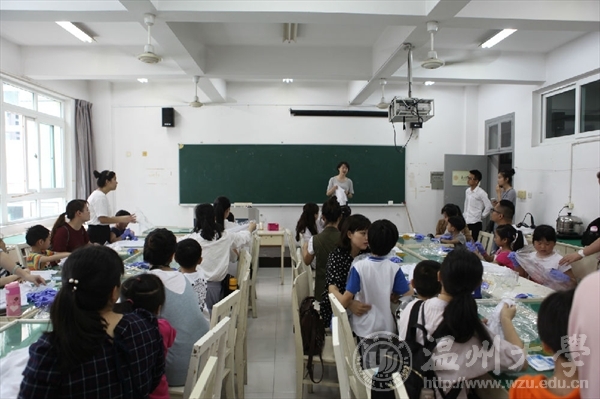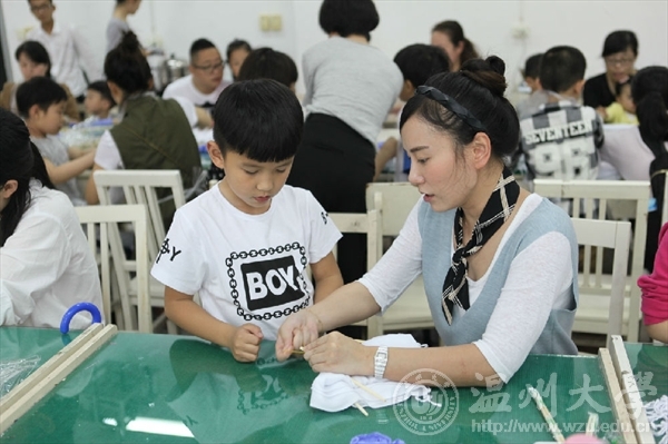杨老师主要讲述了制作工序以及期间需要注意的问题。之后,孩子家长们就投入到实践中,谨慎地设计,小心地穿线,打结,褶皱,全心全意。不久后,陆陆续续的完成了“扎”,接着便是“染”的环节了。家长和孩子们将准备好的围巾,浸泡并且进行染色。经过一段时间的等待,在拆线解绑的瞬间,家长和孩子们都露出了欣慰的笑容。