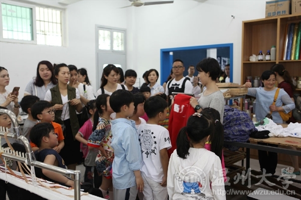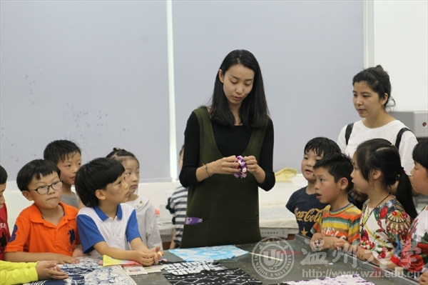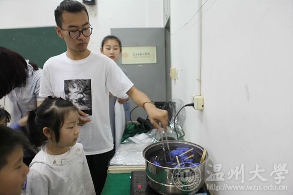 杨老师向大家介绍了KY开元集团官网入口美术学院印染实验室。张老师向家长孩子们介绍了“扎染”的发展历史,展示了五颜六色的扎染成品。孩子们都全神贯注的看着,还积极的向老师询问扎染的方法。扎染古称扎缬、绞缬、夹缬和染缬,是中国民间传统而独特的染色工艺。 其工艺特点是用线在被印染的织物打绞成结后,再进行印染,然后把打绞成结的线拆除的一种印染技术。它晕色丰富,变化自然,趣味无穷。更使人惊奇的是扎结每种花,即使有成千上万朵,染出后却不会有相同的出现。这种独特的艺术效果,是机械印染工艺难以达到的。