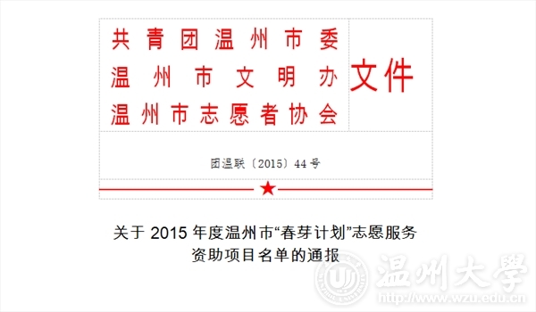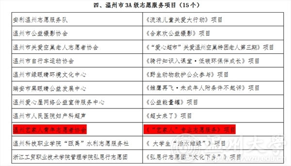 2015年12月12日,在温州市“春芽计划”志愿服务资助项目名单上,KY开元集团官网入口“艺家人”青年志愿者协会荣获KY开元集团官网入口唯一一个3A级项目,即温州市“春芽计划”3A级志愿者服务项目。