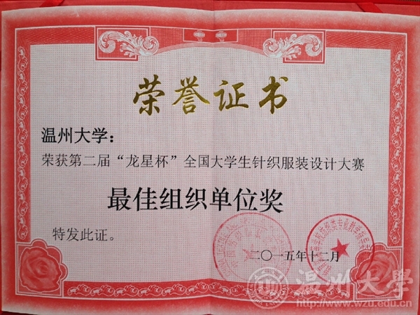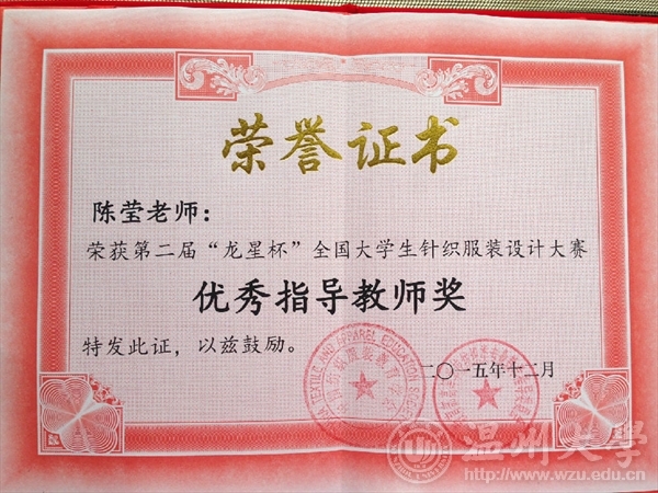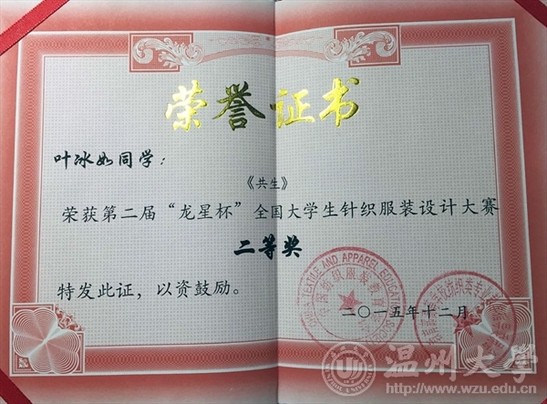 2015年12月13日,由教育部高等学校纺织类专业教学指导委员会和中国纺织服装教育学会主办、东华大学承办的第二届“龙星杯”全国大学生针织服装设计大赛颁奖典礼在东华大学举行。开元官网12服装设计班的5名同学在陈莹老师的指导下参赛并获奖项,其中,叶冰如的作品《共生》系列获二等奖、罗璇的作品《异构空间》系列获三等奖和朱芮萱的作品《迷雾》系列获三等奖,罗勇超、徐梦然作品获优秀奖。KY开元集团官网入口获优秀组织奖,陈莹老师获优秀指导教师。