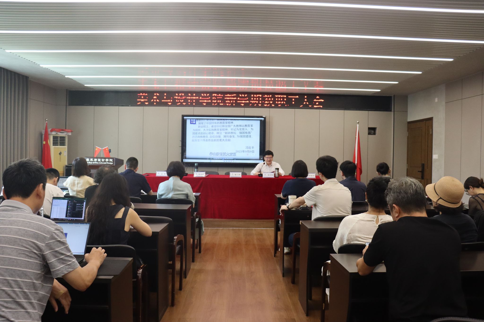 随后,胡文超副院长、叶如芳副书记、高玥副院长分别就各自分管领域进行工作部署,明确新学期工作重点与方向。最后,刘青松书记作总结讲话,围绕学院新学期的核心任务,强调要“坚持一个统领,决胜两大攻坚,谋划一张蓝图,提升三大动能”,并对会议内容进行回顾与强调,鼓励全体教职工凝心聚力,为学院发展贡献力量。