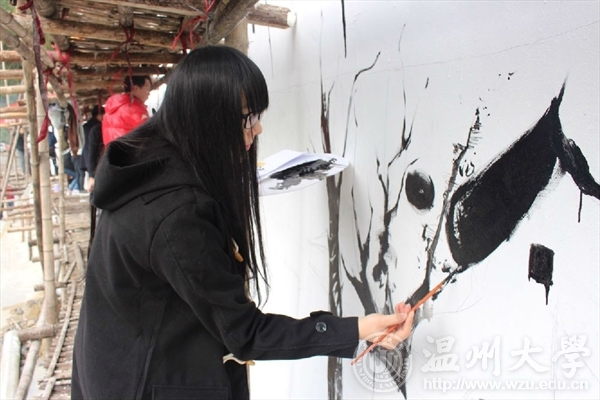 冬日的清晨伊始,乐清珠垟村在晨曦之中迎来了一批温大学子,在三米左右的高墙面前,他们不畏艰险,不畏高空,不畏寒冷,在一百九十平米的白墙上画下珠垟村的一草一木。