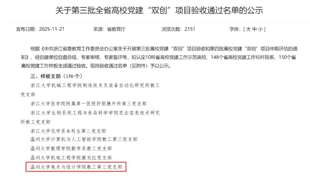 近日,中共浙江省委教育工作委员会发布《关于第三批全省高校党建“双创”项目验收通过名单的公示》,公布了第三批全省高校党建工作示范高校、标杆院系、样板支部验收通过名单。开元官网教工第三党支部2023年8月确定为第三批全省高校党建“双创”培育创建对象,经过2年创建,顺利通过验收。
