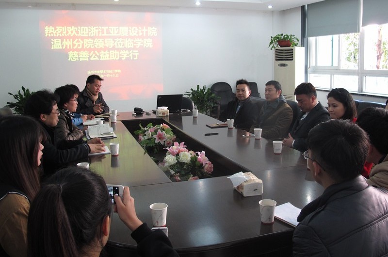 首先,杨振海副书记对出席此次慈善公益助学的亚厦温州设计院领导一行表示感谢。随后设计系朱广宇主任就亚厦项目进课堂做了介绍,他提到这个教学改革能帮助大学生的课堂与实习就业对接,使学生毕业后能更好地走上就业岗位。而亚厦作为设计界的一位领头军,也非常重视后备力量的培养,学院很多学生走进亚厦,在胡逸院长等很多老师和设计届精英的带领下,进入各个分院或设计工作室进行学习深造,最后也有不少学生在实习结束后正式加入亚厦工作。在亚厦温州设计院实习的11环艺班的同学代表也作了实习感想发言,有同学说,亚厦是一个温暖的家庭,同事间融洽互助;有同学说亚厦的工作环境舒逸,但工作严谨,让人学到很多知识和技能;也有同学说亚厦是一个真诚的大家庭,希望能一直在这样的氛围里工作实习……