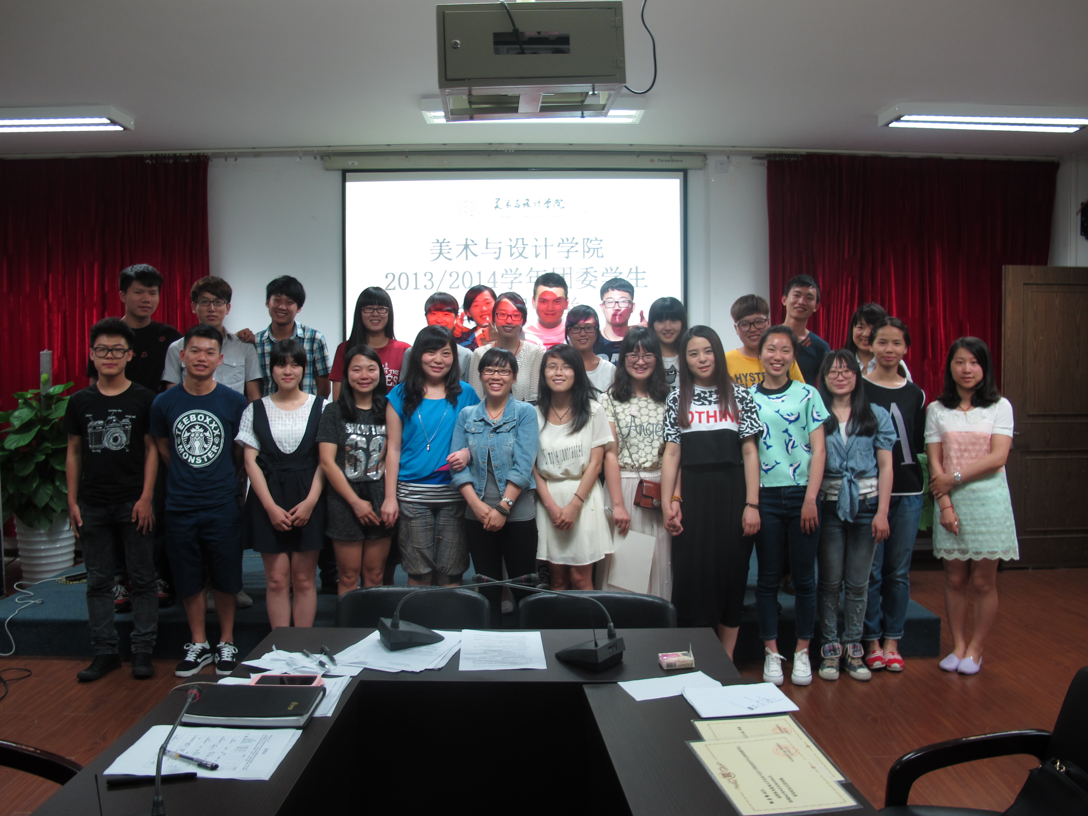 5月28日下午,一年一度的学生会干部换届选举大会在2B4001举行。为力求公开、公平、公正,会议采取学生现场投票的方式。出席本次会议的有学院学生科辅导员杜茜老师、学生会全体成员、“艺家人”青年志愿者协会全体成员、以及13级各班班长。 大会进行第一项议程,由团委副书记邹启豫讲话,她首先肯定了近一年来的团学各部门的工作,分享了自己三年在团委学生会的成长历程,她希望新一届的团学干部能担起责任,握好接力棒,为美院团学的跨步发展续写新的篇章。 2014—2015届主席团和副部长候选人上台演讲。他们用真挚温情的语言回顾了在学生会一年的工作和心得,感谢指导老师和主席团成员给予的帮助,同时展现了自己胜任新竞聘岗位的优势和能力,表示会再接再厉,愿为美院团学的发展贡献出自己的力量。 在老师和监票员的见证下,进行了严谨有序的投票、计票环节,最终选出团委副书记金李斌、主席吴荣婷、副主席叶佳颖、副主席兼青协会长冯渝渝等新一届学生干部。 最后,杜茜老师为上一届学生干部颁发了聘书,同时作了总结讲话。她讲到了三个关键词——“感谢、感动、希望”,她说,感谢团委学生会每位成员一直以来的辛苦付出,感动于每个部门尽职尽责的团队精神,希望新的一届继续保持乐于奉献、敢于担当的品质和善于创新、勇于超越的精神,相信大家一定能够打造出一支更富有凝聚力和创新力的学生队伍,共同迎接美院团学更加美好的明天。