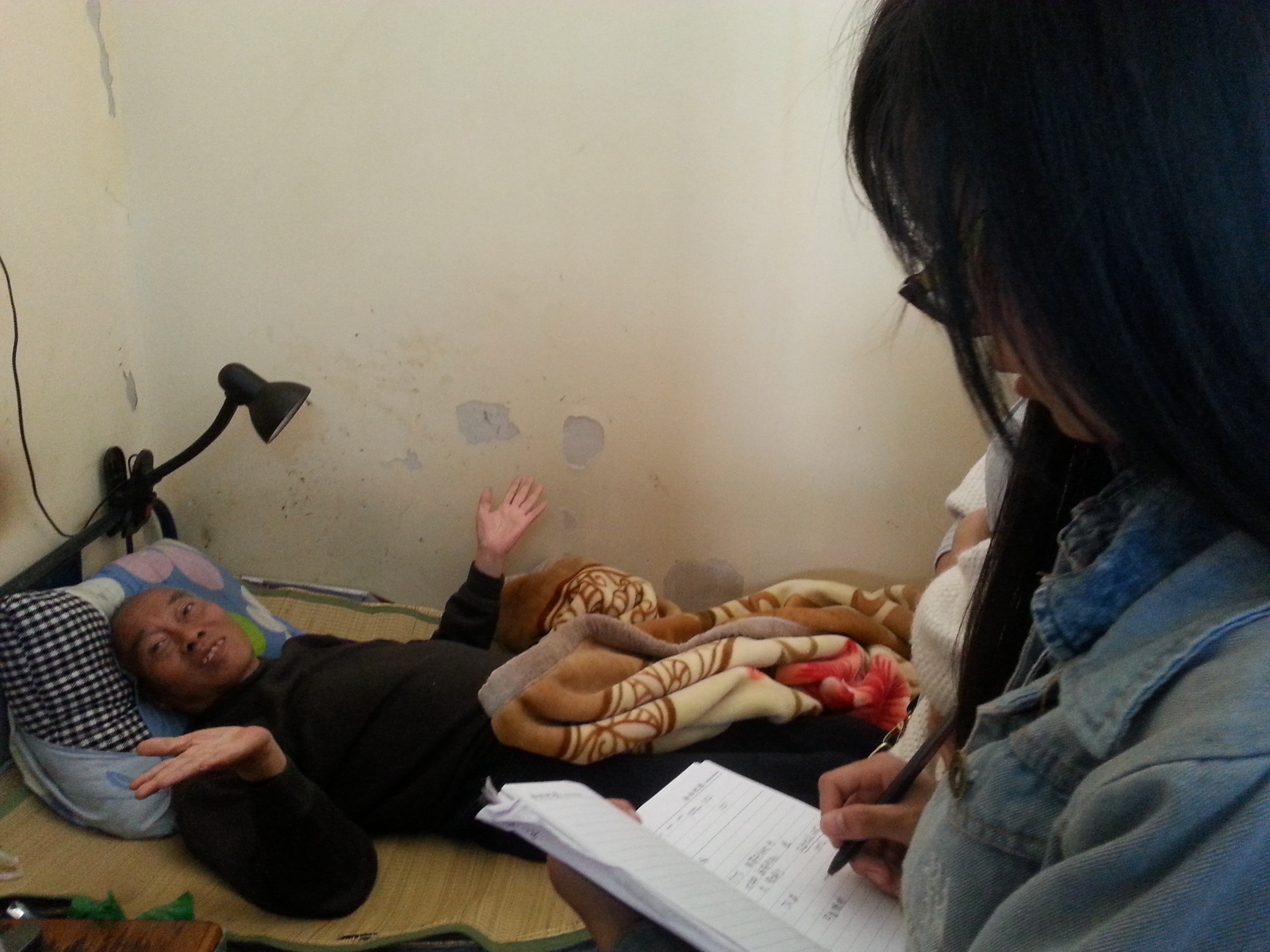 早上8点,参加此次活动的负责人、志愿者和校瓯语社成员在E区门口准时集合,经过一个半小时左右的路程, 志愿者们终于来到了杨府山敬老院。在敬老院负责人的指引下,一行17人来到了三楼汤德新老先生的房间。汤爷爷因为车祸卧床二十年,他对志愿者们的到来感到十分惊喜。他向大家聊起了自己年轻时候的经历,虽然很多的情节片段已然模糊,但从老人的言谈笑语中,大家还是能感受到那份发自内心的自豪和满足。