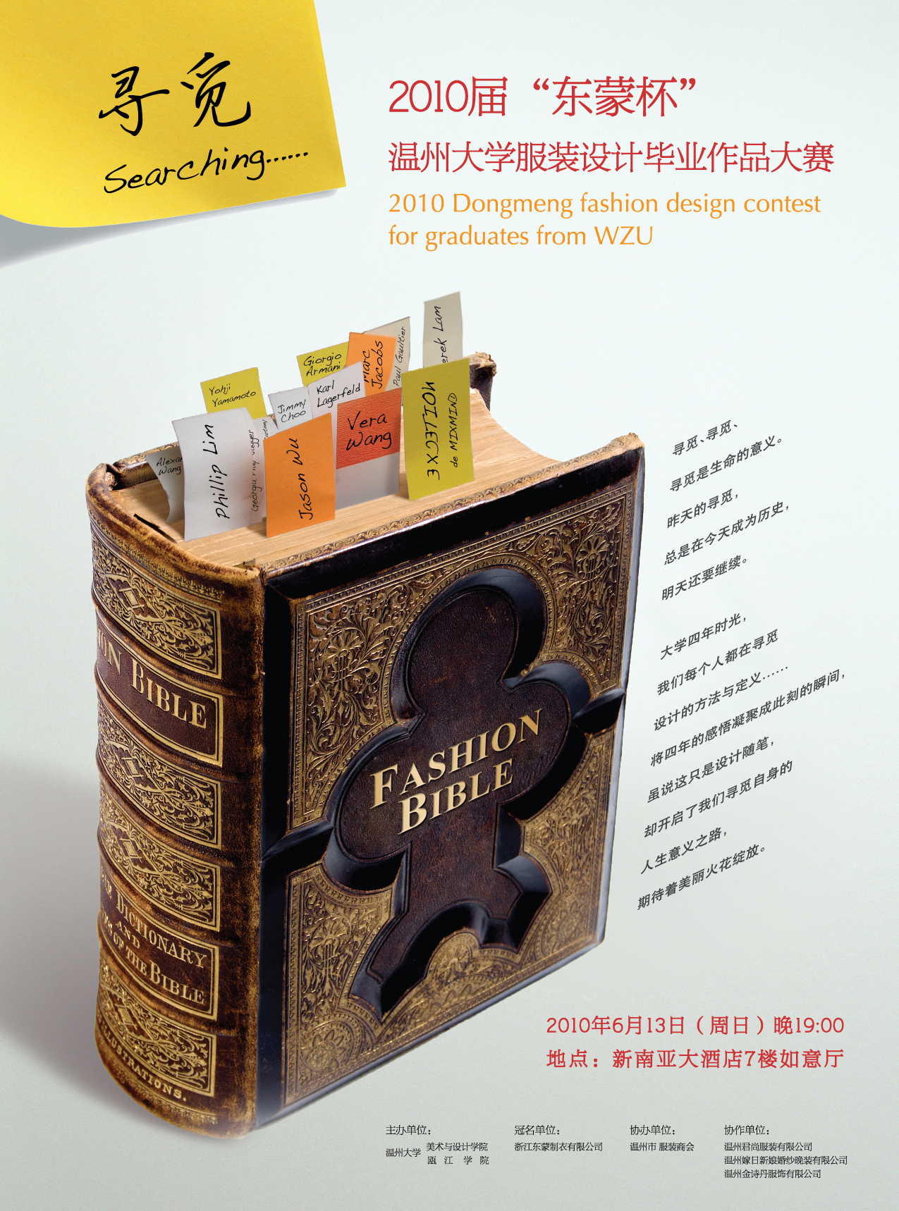 流行缤纷,霓虹异彩。一年一度的服装设计专业毕业设计作品动态展即将揭开她神秘的面纱。多年来,我们欣赏了她的优雅高贵、纯洁浪漫,见识了她的秀丽妩媚、热情奔放。今年,她将带着更为绚丽成熟的魅力,更富创意设计的姿态,奉献给我们一场时尚的饕餮大餐。在她身上,我们可以领略风格鲜明、个性独特的服装魅力,感受时尚精美、收放得体的整体造型,了解2011年服饰的时尚前沿与流行趋势…… 本次大赛主题为“寻觅searching”,服装展示分四大板块:品牌T台秀、时尚职业装、时尚礼服和创意概念装。模特主要来自KY开元集团官网入口服装表演班的优秀学生及专业星娱公司名模。 历年来,KY开元集团官网入口服装系与温州多家知名服装企业合作,以服装设计大赛的形式共同完成毕业设计,秉承“以赛促学,以展促学,以校企合作促就业” 的教学理念,搭建校企互动平台,为地方服装产业培养了大批服装类专业人才。 展示时间:2010年6月13日(周日)晚19:00 展示地点:新南亚大酒店7楼如意厅 主办单位:KY开元集团官网入口 瓯江学院 冠名单位:浙江东蒙制衣有限公司 协办单位:温州市服装商会 本次动态展有部分席位向全校师生开放,需凭票入场,数额有限,领完为止。 领票时间:2010年6月9日(周三)8:00—16:00 领票地点:KY开元集团官网入口南校区2B-214办公室 联系电话:86689181 联系人:曹老师 KY开元集团官网入口 瓯江学院