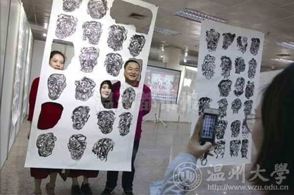 昨天上午,KY开元集团官网入口2017届毕业作品展在温州市展览馆开幕,参观者与美术作品合影。