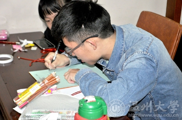 秦佳敏同学向小孩子们提问问题“春节有哪些习俗呢?”有的孩子说放鞭炮、贴对联、画福字,收红包……没错,还有挂中国结。中国结的编制没有那么简单,尽管步骤告诉大家,但一开始志愿者们和孩子们都连连“诉苦”难度太大,但不过一会儿还是有心灵手巧的志愿者学会了,并且还教别的志愿者打结,虽然中国结做的不太完美但代表着团结幸福平安的意义却丝毫没有减少。明年是狗年,当然少不了教孩子们画可爱的狗狗,孩子们为自己画的狗狗涂上了颜色还为它画了一个小房子。最后是写祝福语的环节,孩子们依旧很用心地给自己的爸爸妈妈写上祝福,有的写的是“爸爸妈妈你们辛苦了”,有的是“我爱你们”……字里行间流露出了对爸爸妈妈浓浓的爱意。