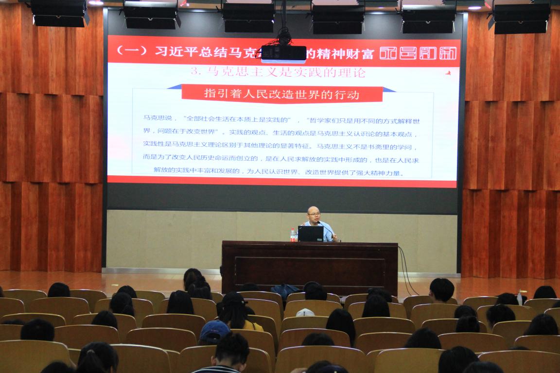7月2日上午,KY开元集团官网入口在雁山厅开展本学期第二次形势与政策课,KY开元集团官网入口马克思主义学院副院长卓高生做题为“感受信仰的力量 高扬伟大的旗帜——学习贯彻习近平总书记在马克思诞辰200周年上的重要讲话”的形势与政策讲座。KY开元集团官网入口17级全体同学参加讲座。卓高生老师从回到马克思、走进马克思、学习马克思三个方面进行解读。通过回顾马克思的一生,可以得出这样的结论:马克思的一生,是胸怀崇高理想、为人类解放不懈奋斗的一生;是不畏艰难险阻、为真理而勇攀高峰的一生;是为推翻旧世界、建立新世界而不息战斗的一生。回到马克思,需要重读经典,也要摒弃教条式的解读。走近马克思,需要辨识、辨析、辨明马克思主义,习近平总书记总结马克思留下的精神财富是指出:“马克思主义是我们立党立国的根本思想。背离或放弃马克思主义,我们党就会失去灵魂、迷失方向。在坚持马克思主义指导地位这一根本问题上,我们必须坚定不移,任何时候任何情况下都不能有丝毫动摇”。纪念马克思诞辰200周年大会上,习近平主席高度评价了马克思的一生,并就学习和实践马克思主义提出9个方面的要求,为新时代坚持和发展中国特色社会主义进一步指明了前进方向。卓高生老师指出,在马克思诞辰200周年的今天,对马克思最好的纪念和告慰,对马克思主义最好的坚持和继承就是:在新时代我们要在坚持中发展、在传承中创新,不断开辟当代中国马克思主义、21世纪马克思主义新境界。
