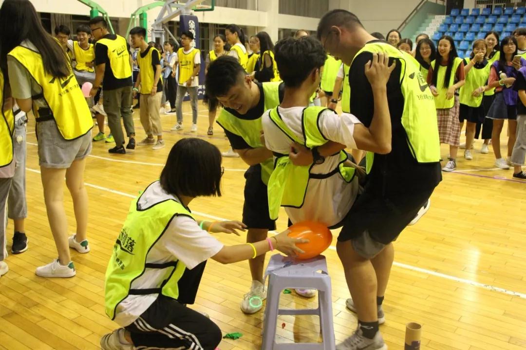 接着,各支队伍开始进行“压气球”游戏,一个人扮演嘴吹气球,一个人扮演手将气球送至终点,两个人扮演腿抬起扮演屁股的同学压爆气球,同学们分工合作,各尽其力,在游戏中体会团结协作的快乐,也让彼此之间更加熟悉。