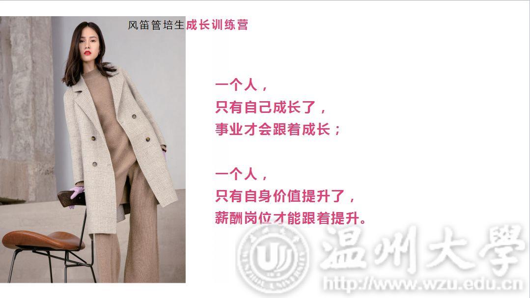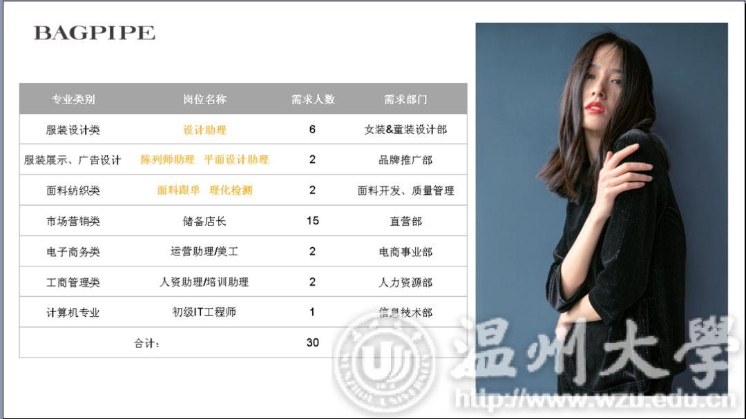 10日19日上午,Bagpipe风笛2019无限想象全国高校巡回宣讲会在美院顺利展开。在多年的合作与交流当中,风笛与温大也结下了不解的情缘。本次宣讲会有学院党总支副书记杨振海与风笛服饰有限公司经理吴朝晓莅临宣讲会现场。 首先是杨书记致开场词,在同学们热烈的掌声中,杨书记侃侃而谈。“温州风笛服饰有限公司与温大美院搭建了一个非常典型的校企合作平台,风笛公司作为我校省级校外实践教育中心,与开元官网在专业教学、实习实训、就业创业等领域开展全面战略合作,我们非常高兴看到风笛公司一直以来欣欣向荣的发展态势,也希望双方能携手结出更多合作成果。” “不忘初心,使命必达。”风笛宣讲人缪老师在分享风笛创始人创业史、发展史,讲述风笛的过去、现在与未来,同学们都听的津津有味。宣讲会在主持人和同学们的互动中开始后,主持人分别从公司品牌设计风格,员工的衣食住行娱,薪资问题和管培生培养计划等几个同学们关心的方面来介绍风笛服饰有限公司的细节。BAGPIPE风笛成立于1999年,是一家自主开发、生产、销售时尚女装和童装的品牌经营企业。风笛公司的女装品牌分为周末时尚,摩登帅气,精致优雅三个风格,而风笛公司的童装品牌的定位则是针对2-8周岁的儿童设计的,风格多样是风笛公司的优势所在。衣食住行方面,风笛公司也非常重视员工的感受,为他们提供了舒适的环境以便于员工们更好的工作和生活。同时,风笛公司也十分重视对人才的培养,也有一套完整的体系进行人才的引入。这便是风笛管培生培养计划的由来。对于进入风笛上班的应届生,风笛建立了完善的“管培生培养计划”,全面打造“一专多能”的复合型人才,让每个进入风笛的应届生迅速成长,成为独当一面的技术或管理人才。在经过由系统培训、店铺见习、核心轮岗和专岗实践四个环节的管培生培养计划之后,实习生便能更好地融入公司这个大集体。说到薪资方面的话题,风笛公司的PPT上有着这样一段话:“一个人,只有自己成长了,事业才会跟着成长。一个人,只有自身价值提升了,薪资岗位才能跟着提升。”从这段话中我们也可以清晰地看到风笛公司对人才和员工能力的重视。对于服装设计、服装展示、广告设计、面料纺织类的专业,风笛公司也提供了如设计助理、陈列师助理、平面设计助理、面料跟单、理化检测的专业让同学们选择,以便给予同学们更大的就业空间。 “风笛未来,无限可期。”这是这场宣讲会的结束语。无限可期的不仅是风笛的未来,也同样是我们美院同学们明媚的未来。正如主持人所说,人生不设限,未来就会精彩无限。我们也相信同学们在一番拼搏之后,会绽放出人生绚丽的芳华。