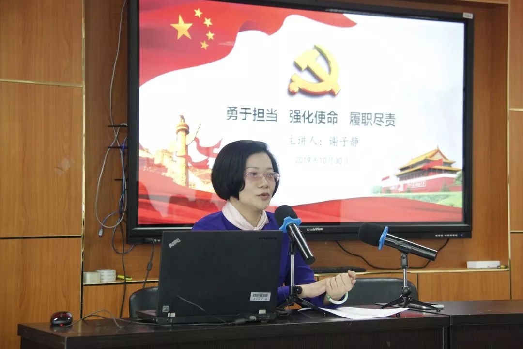 谢子静院长为全体教工党员讲了题为“勇于担当、强化使命、履职尽责”的专题党课。谢院长以习近平总书记对主题教育提出的具体目标“干事创业敢担当”作为切入点,围绕着什么是担当?如何担当?以及怎么去担当?三个方面进行充分阐释。谢院长指出担当体现着党性,是共产党员的优秀品格,大事难事看担当;担当意味着责任,有无担当意味着学院的事业能否推进,党的干部要能挑起担子、接受考验;担当彰显着作风,真担当需要信守承诺,求真务实,只有真担当才能干出真业绩。