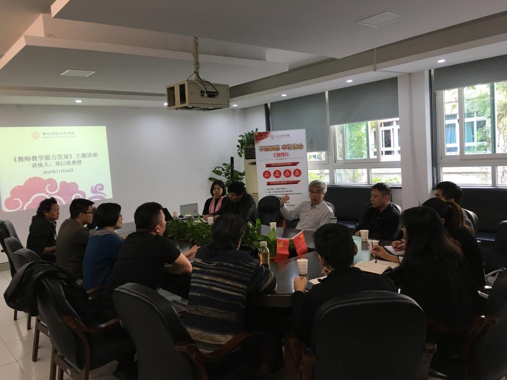 郑教授从教学的本质讲起,娓娓道来,从艺术类课程目前课堂教学现状与前沿教学现象,如手艺与学术结合、纯艺与传承、艺术当代活用,艺术类教学特点的教学探索,教师在教科研面临的职业发展困难等方面深入浅出的与与会教师们进行了探讨,气氛活泼轻松,既有理论又有实例,引人入胜的启发了与会教师的思考引起了强烈的共鸣。他强调教学最重要的是培养人--强调教学灵活,设计适用教学对象适用当前时代特点的教学方式的重要性。