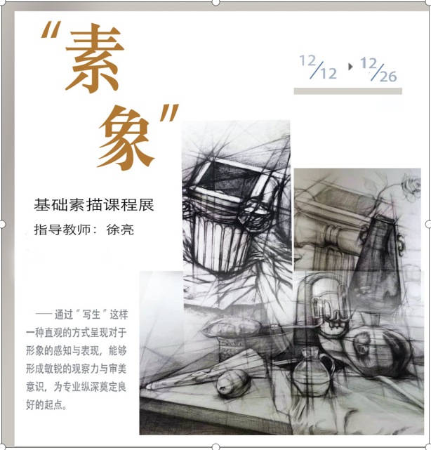 2020年12月12-26日,题名为“素象”的课程联展在KY开元集团官网入口一楼展厅开展,集中展示由徐亮老师指导的20级设计五班与20级研究生学科教学美术班的基础素描教学成果。