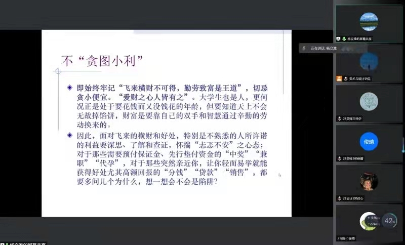 2021年12月22日晚18点,KY开元集团官网入口2021级形势与政策报告会在疫情防控的要求下于线上举行。本次会议的由KY开元集团官网入口学工办主任杨鹏老师主持,并特邀了马克思主义学院党委书记王柏民老师、KY开元集团官网入口纪委副书记杨立淮老师以及KY开元集团官网入口学生共计两百余人。本次会议旨在通过线上讲座的形式,为广大学生解读马克思主义宗教观以及构建网络安全生态环境下对大数据时代的思考,进行反诈防诈教育,建设和谐安全的校园。杨鹏老师首先指出大学生应当树立正确的的宗教观,在校园中不得传教、举行宗教活动,而王柏民老师则为我们展开解读了马克思主义宗教观。王柏民老师首先讲解了目前我国的宗教工作形势,告诉我们要尊重宗教信仰自由;引导宗教与社会主义 社会相适应;构建积极健康的宗教关系;宗教工作法治化。共产党员、共青团员要做坚定的无神论者,绝不能在宗教中寻找自己的价值和信念。王柏民老师特别强调了宗教事务管理的“20字原则”,学校里不得传教、举行宗教活动以及中国共产党纪律处分条例有关信仰宗教部分。大学是人生观、价值观、世界观形成和构建的重要阶段,也是最脆弱、最易被动摇的时期,在这个时期,我们需要坚持马克思主义,认识马克思主义,才能在营造更加和谐的校园,在大学生活中不断前行。紧接着,杨立淮老师为大家讲解了在构建网络安全生态环境下对于大数据时代的思考。杨立淮老师主要从两个部分为我们进行讲解,分别是大数据时代的互联网思维及应对与阅听社会——提升媒介素养。杨立淮老师通过电商魅力与蝴蝶效应的两条教训告诉我们世界是相连的,要在大数据时代下抓住机遇,才能拥有更好的发展。而在互联网快速发展的前提下,要让互联网为我所用,而不能成为互联网的“奴隶”,老师首先分析了当代大学生媒介素养的现状,以此为前提,告诫我们“飞来横财不可得,勤劳致富是王道。”作为新时代大学生我们应谨记不要贪图小利,预防电信诈骗“六个一律、八个凡是。”所谓害人之心不可有,防人之心不可无,互联网时代与大学生息息相关,我们要提高警惕,提升防范和辨别诈骗的能力和水平,推动建设更高水平的平安校园。至此,此次形势政策报告会圆满结束,相信各位同学受益匪浅,更加深入的了解马克思主义宗教观与网络安全生态环境,我们应加强自律意识,提高警惕,小心防范,常扫心中“灰尘“,正确认识,共同构筑更加和谐安全与美好的安全!