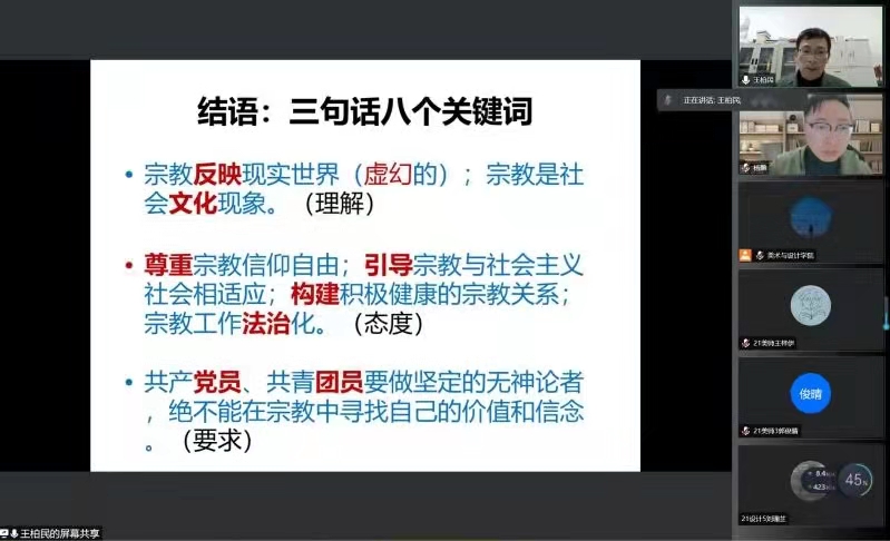 2021年12月22日晚18点,KY开元集团官网入口2021级形势与政策报告会在疫情防控的要求下于线上举行。本次会议的由KY开元集团官网入口学工办主任杨鹏老师主持,并特邀了马克思主义学院党委书记王柏民老师、KY开元集团官网入口纪委副书记杨立淮老师以及KY开元集团官网入口学生共计两百余人。本次会议旨在通过线上讲座的形式,为广大学生解读马克思主义宗教观以及构建网络安全生态环境下对大数据时代的思考,进行反诈防诈教育,建设和谐安全的校园。