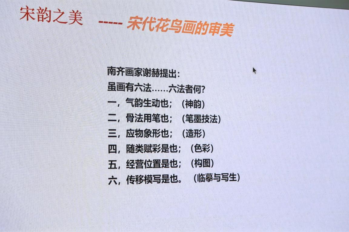 “一花一世界,一叶一菩提。”“心窍玲珑貌亦奇,荣枯只在手中移。”“妙在似于不似之间”……5月9日下午,2022温州青年艺术周之宋韵瓯风雅集系列活动的“宋韵之美——宋代花鸟画作品赏析”主题讲座在南怀瑾书院举行。该讲座主讲人是KY开元集团官网入口院长谢子静教授,她通过对宋代花鸟画作品的赏析,带大家一同感受宋韵之美,体会宋朝千年的生活美学魅力。宋代是中国花鸟画的成熟和极盛时期,在应物象形、营造意境、笔墨技巧等方面都臻于完美。据《宣和画谱》记载,当时宫廷藏画见于著录的作品有6396幅,其中花鸟画就占一半以上,可见花鸟画在宋代创作之盛况和宫廷对花鸟画的重视程度。宋朝是中国历史上经济、文化、教育最繁荣的时代,达到了封建社会的巅峰。著名史学家陈寅恪说:“华夏民族之文化,历数千载之演进,造极于赵宋之世。” 汴梁、汴京,为宋朝国都长达168年,历九帝,是当时著名的文化、经济、艺术、政治中心,其繁荣程度,后世难以企及。这次讲座,谢子静教授主要围绕“气韵生动之美”和“意境之美”两个内容进行解读,通过宋代的人物、山水画作品了解宋代的经济、文化和美学思想;通过对《果熟来禽图》《杨柳乳雀图》《出水芙蓉图》《疏荷沙鸟》等经典宋画作品作为案例来赏析,带观众感受这些画中藏着的“气韵生动之美”和“意境之美”。“气韵生动”是中国绘画创作的最高原则,是中国画艺术精神的集中体现,也是判断绘画的审美境界的价值标准。而“意境之美”是中国传统美学思想的重要范畴,在传统绘画中是作品通过时空境象的描绘在情与景高度融会后所体现出来的艺术境界。“大家对一幅画的点评,日常听到最多的是画得真美、真像啊,或者是用笔好细腻之类的。我也很好奇,今天来的朋友们会怎么去欣赏一幅画。”在互动环节,在场观众也在积极发言。一位业余绘画爱好者回答:“我不是从技法点评,而是从自己的内心感受。比如一幅画里有出现昆虫,我就跟着昆虫仿佛能一起闻到花香。我觉得一幅画好,就是以小见大,我也想与画有互动。当一幅画让我身临其境,那它就是一幅很好的作品。”还有专业的美术从业者回答:“我会去色彩、构图等方面去欣赏一幅画。”还有老先生举手发言说出了宋明理学的“格物致知”精神,指出了宋画的历史背景。每一幅花鸟画的创作,都是经历了由外至内,因物动情,进而由内向外,寄情于物的思考酝酿过程,所至现的是天趣与人的精神,是奇造化而移精神,是在不知不觉中把自然纳入自我,而自己又消融在景物之中,努力创造无我之境。