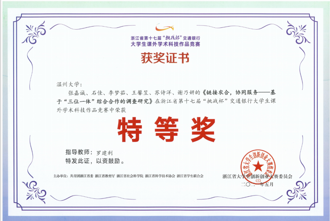 《打造为农服务新载体,创新协同服务新模式——基于“三位一体”综合合作的调查研究》获得第十六届“挑战杯”全国大学生课外学术科技作品竞赛二等奖,提出了由“三位一体农合联”与“三位一体合作社”共同构成的三位一体综合合作体系。该体系从生产、供销、信用方面入手,解决生产技术落后、供销渠道狭窄、周转资金不足等问题,其本质是整合乡村要素资源,打造为农综合服务平台,从而能够有效促进城乡资源双向流动和要素合理配置,为农村发展注入新的动力。在此项目基础上继续开展的新课题荣获浙江省第十七届“挑战杯”大学生课外学术科技作品竞赛特等奖,并向国赛奖项发起冲击。