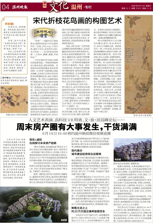 为此,《文化周刊》将从本期开始推出《宋韵瓯风·有赏》栏目,邀请温州文化名人带领读者,通过细品“宋韵”之美,让宋韵文化在温州“热起来、活起来、用起来、强起来”,打响“宋韵瓯风”品牌。