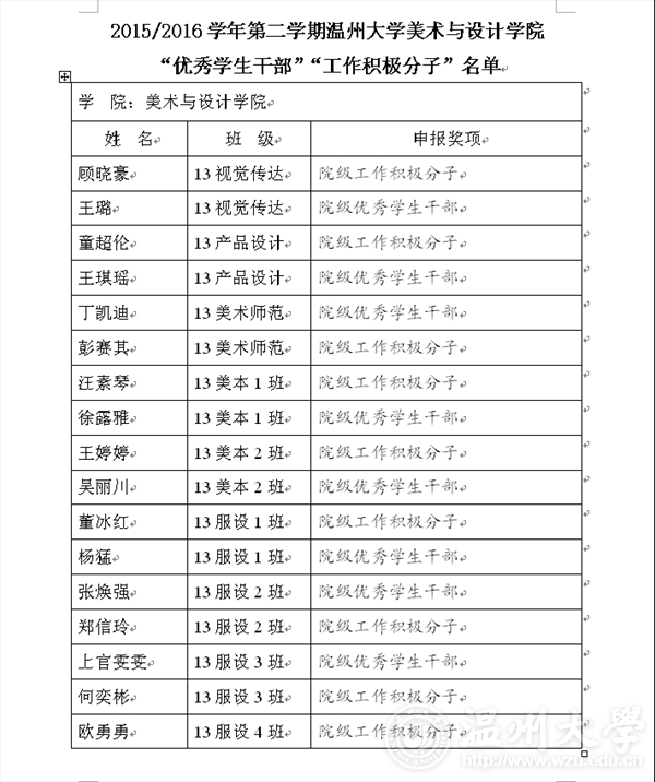 现将2015-2016学年第二学期KY开元集团官网入口“优秀学生干部”“工作积极分子”名单公示如下,如对评选结果有异议,请及时联系美术学院学生科。