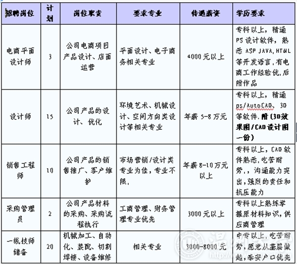 公司简介 山东兄弟商业设施有限公司坐落于五岳独尊的泰山脚下,是国内最早从事商业配套设施生产及卖场形象策划、设计的大型专业厂家,企业以总公司和下设分公司(厂)的集团化模式运营,目前已建设三个厂区,下设:齐鲁兄弟、优仕佳、兄弟佳美著名品牌,年生产总值超亿元。 企业始终坚持奉行“服务精益求精,合作真诚永远”的服务理念,秉承“以专业求生存,以质量谋发展”的经营理念,进行了规范化、系统化、创新化管理,先后通过ISO9001国际质量管理体系认证,荣获“全国质量诚信3A企业”、“中国连锁经营协会理事单位”、“全国工商联烘焙业公会理事”等荣誉。公司网址:www.sd-xd.net 招聘岗位企业以“诚信、责任、合作”的人才观念,为有志之士提供广阔的发展空间及晋升平台。因发展需要,现诚聘以下岗位人员 。 待遇 1、完善的带薪培训:新员工入职培训、销售经理带训、培训公司提供的在职培训等; 2、优厚的福利待遇:提供住宿、交纳五险、提供班车接送、补贴、节假日福利等; 3、广阔的发展空间:公司将为新员工提供广阔的发展平台,及完善的晋升体系。应聘流程 1、欢迎应/往届毕业生通过齐鲁人才网(www.qlrc.com)、中国家具招聘(www.jjrw.com)投递简历或简历命名为“岗位+学校+专业+姓名”投递到指定的电子邮箱:sdxdhr@163.com。 2、参加公司组织的校园宣讲招聘会,现场收集应聘简历。 3、请接到面试通知的同学携带个人简历、就业推荐表、成绩单(院校盖章)、身份证、学生证及其他相关资格证书的原件及复印件用于审核、参加面试。 4、拟录用候选人资料审核及录用审批签订、签订《签约承诺书》 《就业协议书》 5、新员工报到、入职体检、入职手续办理及培训 联系人:傅老师 联系电话:15610709181 0538-8363966 公司网址:www.sd-xd.net 公司地址:山东省泰安市青春创业园晶华路,市内乘坐K6/K25路公交车。
