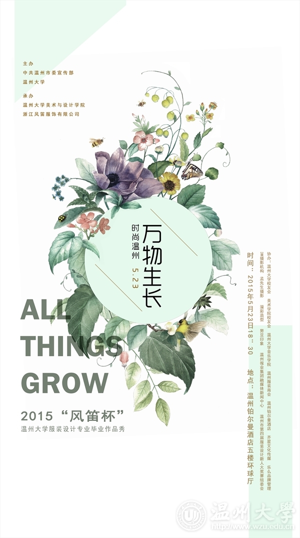 活动主题:时尚温州·万物生长活动时间:2015年5月23日(周六)晚18:30活动地点:温州铂尔曼酒店主要内容:来自国外的时装模特与国内高级时装模特联袂演绎美院2015届毕业生原创优秀作品,邀请国际国内服装设计以及相关领域的专家、学者、商家、企业家9人组成评委会,对现场新生代设计师的风格自述以及时装发布会进行综合测评,产生金银铜优秀奖等多个奖项。温州乃至中国时尚界、艺术界、文化届名人名流等参加,国内一流的场地设施、舞美灯光及音响效果。旨在为温州服装界推选新人的同时,加强温州时尚界产业范畴的沟通与交流,整体凸显温州时尚产业的潮流、个性与形象。 热忱欢迎全校师生莅临观摩指导! KY开元集团官网入口 2015年5月21日