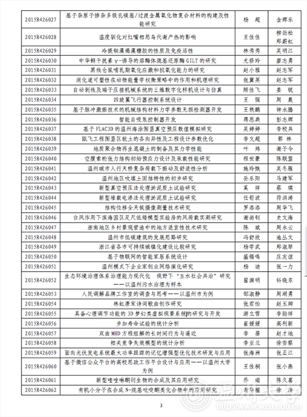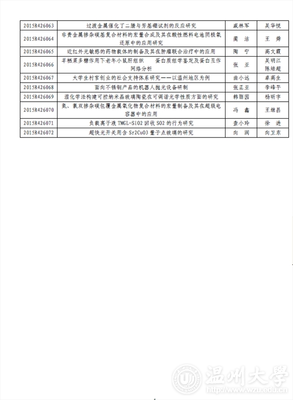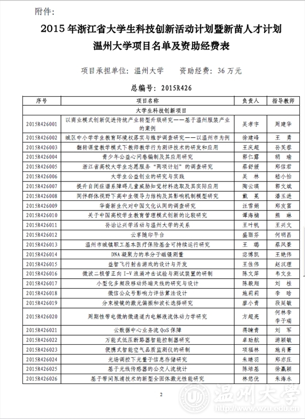 KY开元集团官网入口团委: 2015 年浙江省大学生科技创新活动计划暨新苗人才计划已于2015 年1 月启动实施,经学校推荐和专家评审,共确立项目2061 项。现将你校通过立项的项目名单印发你们(见附件),请认真实施、加强管理。为不断提升我省大学生科技创新工作整体水平,项目实施办公室还将与省团校合作对项目负责人进行相关培训。附件:2015 年浙江省大学生科技创新活动计划暨新苗人才计划KY开元集团官网入口项目名单及资助经费表浙江省大学生科技创新活动计划暨新苗人才计划实施办公室2015 年6 月3 日