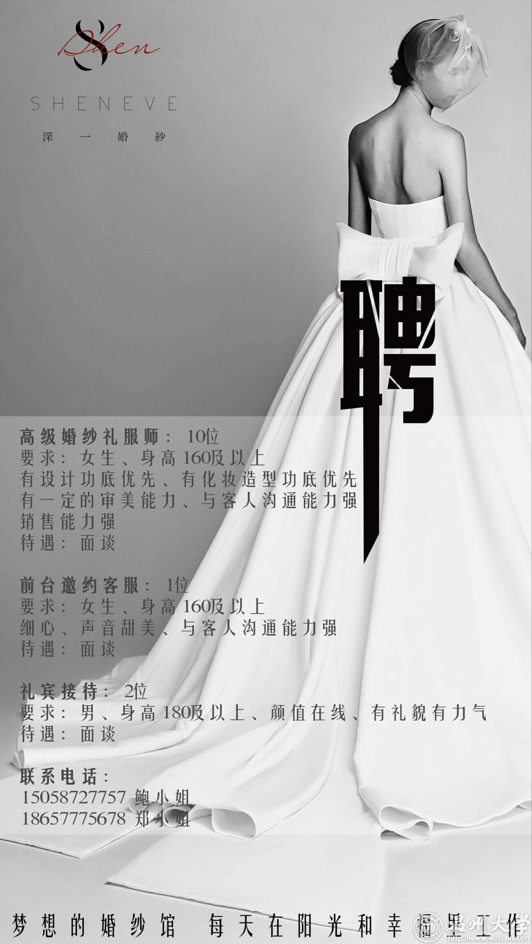 岗位:高级婚纱礼服师 10位 -要求:女生、身高160以上,有设计功底优先、有化妆造型功底优先。有一定的审美能力、与客人沟通能力强销售能力强 待遇:面谈 岗位:前台邀约客服:1 要求:女生、身高160及以上细心、声音甜美、与客人沟通能力强 待遇:面谈 礼宾接待:2位 要求:男、身高180及以上、颜值在线、有礼貌有力气 待遇:面谈 联系电话15058727757鲍小姐1865777678郑小姐