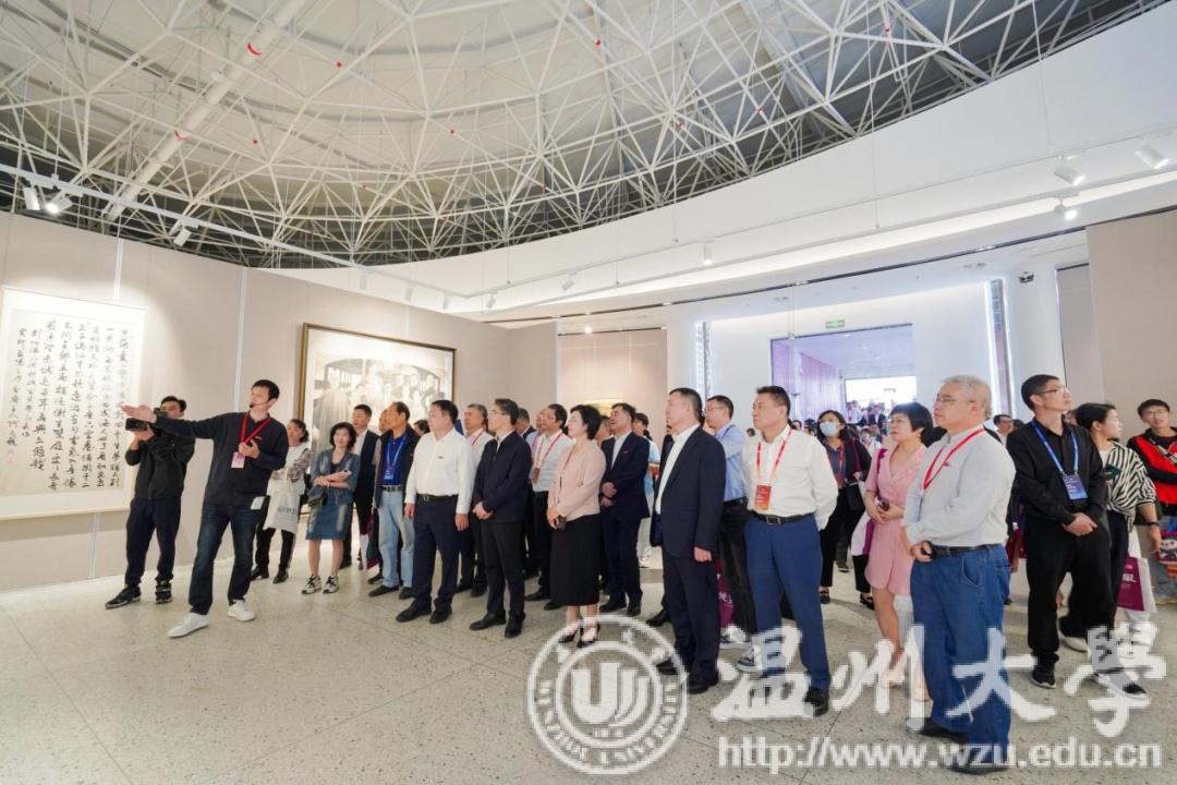 仪式结束,领导、嘉宾、校友、师生共同进入美术馆参观作品展。本次展览分为“先贤风雅”“同道传薪”两大板块,共展出了156位先贤、名家、教师和校友作品,涵盖国画、油画、版画、水彩画、综合绘画、书法、篆刻等种类。展览基于近现代中国美育运动、美术创作的宏大背景,对近代以来温州的书画创作与教育做一个初步的回溯,以近代几位具有代表性的书画大家与“美育大先生”开篇,延伸至温州区域美术创作,以及当代在全国卓有影响的重彩工笔画、书法、版画、水彩画的温籍代表作者;同时梳理学校的美育脉络,展示几代温大人的书画创作,宏扬与传播KY开元集团官网入口的人文风采。