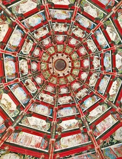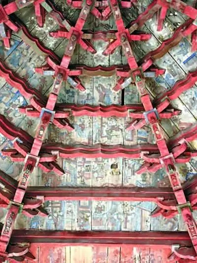 温州古戏台彩绘的画面形态之别致,得益于古戏台建筑结构的繁复与精妙。