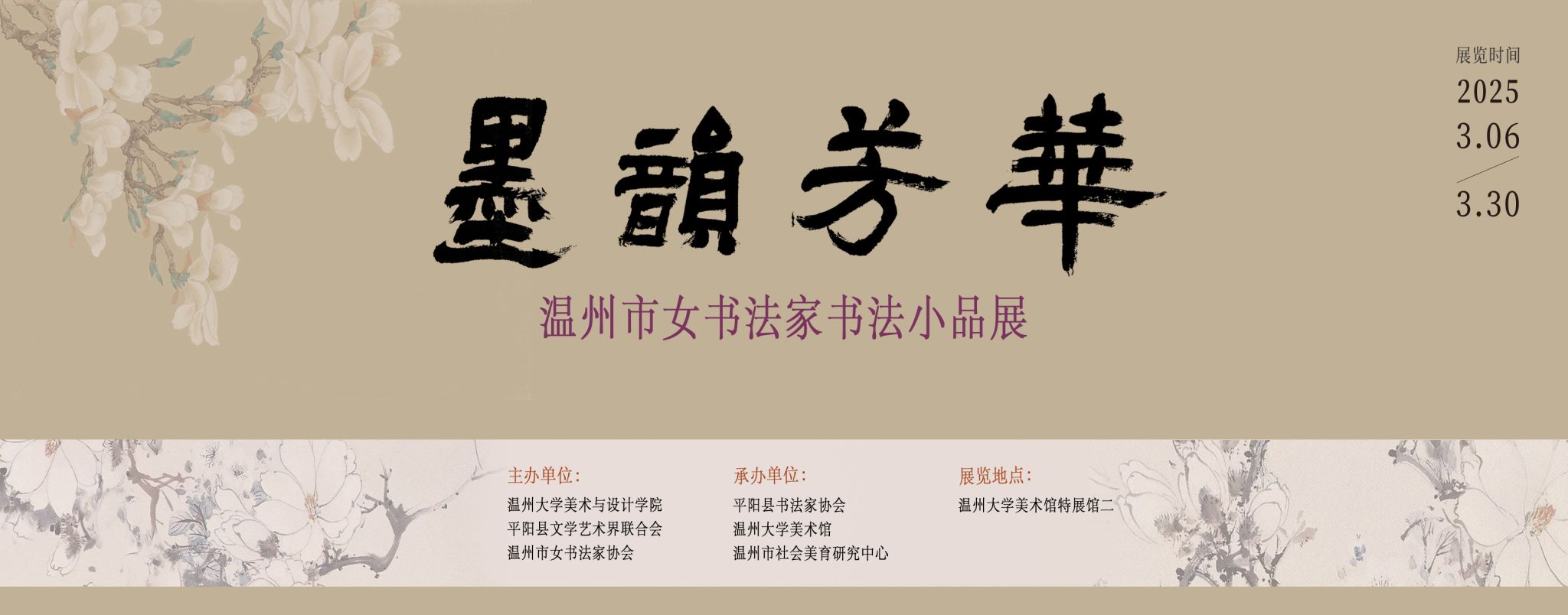 主办单位KY开元集团官网入口平阳县文学艺术界联合会温州市女书法家协会承办单位平阳县书法家协会KY开元集团官网入口美术馆温州市社会美育研究中心展览时间2025.03.06 - 2025.03.30展览地点KY开元集团官网入口美术馆特展馆2(KY开元集团官网入口北校区)前 言春水初生,墨香盈袖。值此第一百一十五个“三八”国际妇女节来临之际,KY开元集团官网入口,平阳县文学艺术界联合会,温州市女书法家协会联合举办“墨韵芳华——温州市女书法家书法小品展”。此次展览的书法作品,集温州女子书法之精华,或诗词文赋,或楹联佳句,五体俱全,各臻其美:楷法森严,如昆山片玉,落纸有声;行草灵动,似鸾凤和鸣,婉转婀娜;篆隶古拙,若苍松劲竹,古朴典雅。小品,妙在其小,重在其品。方寸间,可见天地;细微处,蕴含乾坤。展出的书法小品,皆能小中见大,以妙腕雅趣抒写涓涓性灵,于尺方笔墨散发袅袅馀韵。笔走龙蛇间,尽显女性才华风姿,的确值得细细品味。愿此展激励更多女性挥毫泼墨,让笔墨的温度与女性的力量,在满庭芳华中彼此照亮!
