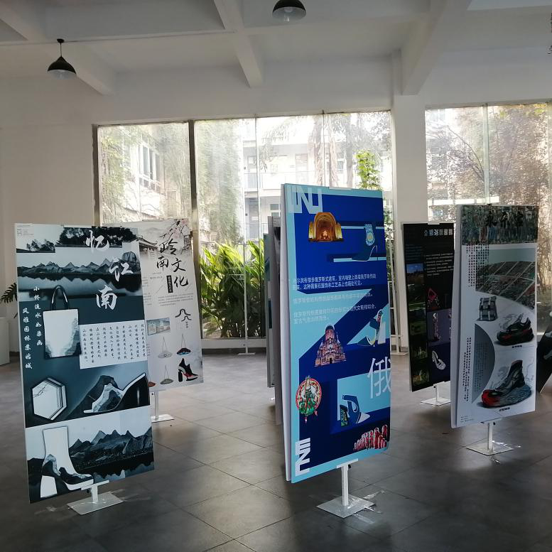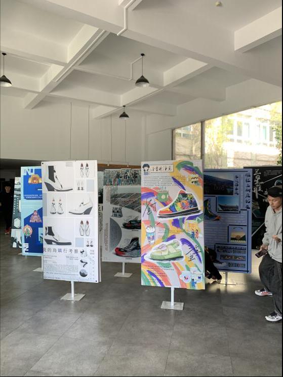 2020年11月9号早上8点20分,由祝忠良老师指导的17服设(鞋履与饰品设计)班《社会实践(艺术采风)》作品展览在KY开元集团官网入口2B一楼展厅展出。展出时间为11月9日至17日。由于疫情影响,本次艺术采风经学校审批后,少部分同学由学院老师带队出行,大部分同学则采用自行就近选择考察地出行的方式同时开展。正因如此,本次采风考察显得格外有别于以往,考察地点有乌镇、西安、上海、四川等,学生们通过为期一周至三周的艺术考察感受到了当地的艺术气息、文化底蕴。本次展览以展板形式呈现,展示内容主要由同学们在艺术采风过程中收集的当地民胜古迹图片为主,结合当地艺术相关的传统纹样、色彩等民俗文化资料,以图文结合的形式制成。经教师指导,同学们在大量收集考察资料的基础上,进行提炼设计元素并做深入研究,运用于鞋款、包款饰品等设计。 (供图:李树朋)