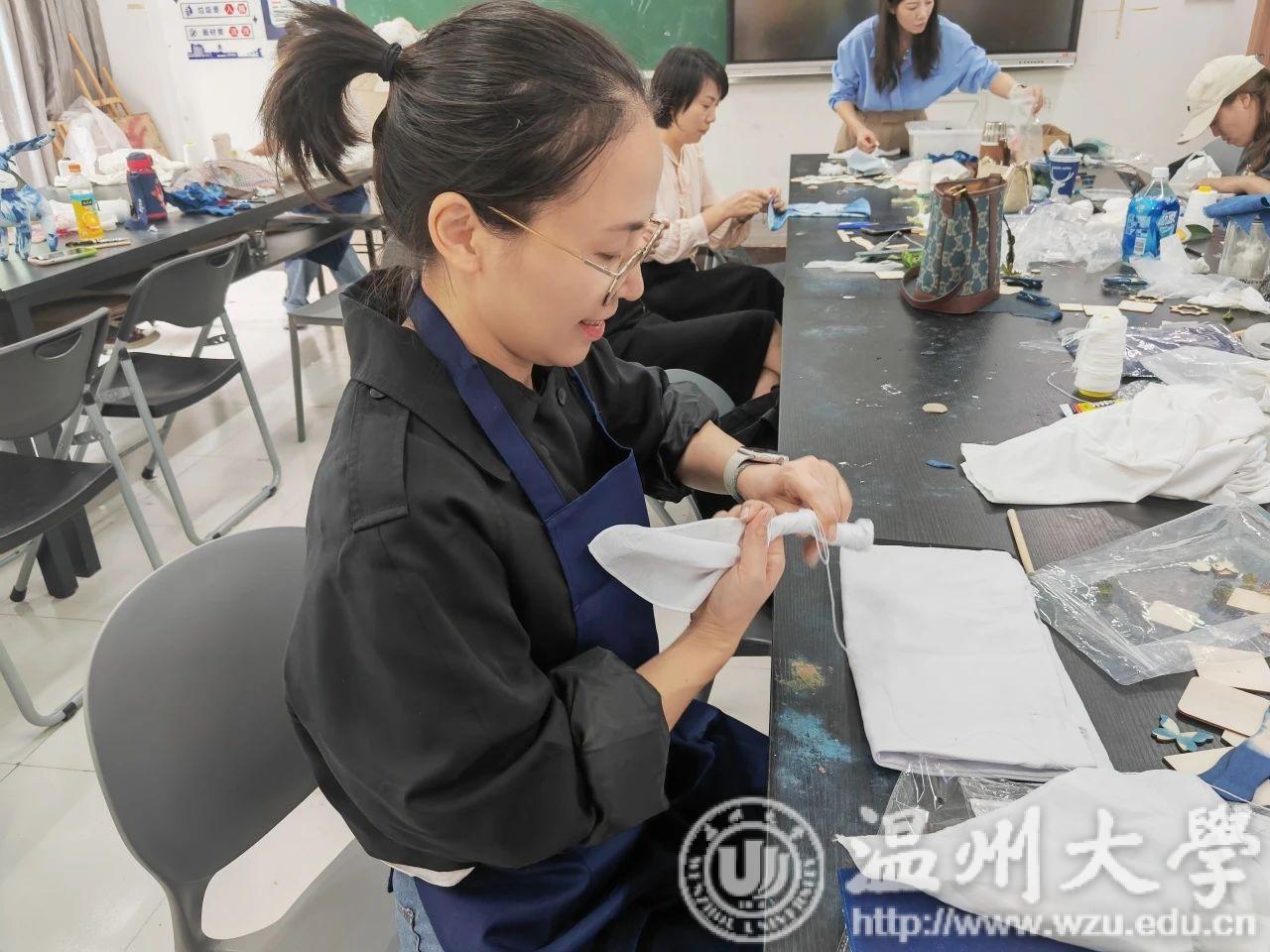 夹缬作为最古老的的一种印染艺术,温州蓝夹缬现已成为国家级的非物质文化遗产。学员们参观蓝夹缬采成博物馆,聆听国家级非遗传承人王河生老师的亲自授课。